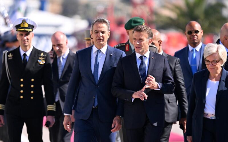 Ο πρωθυπουργός Κυριάκος Μητσοτάκης με τον Πρόεδρο της Γαλλίας Εμμανουέλ Μακρόν έφθασαν στην αποβάθρα 12 στο λιμάνι του Πειραιά προκειμένου να επισκεφθούν τη φρεγάτα «Κίμων».
