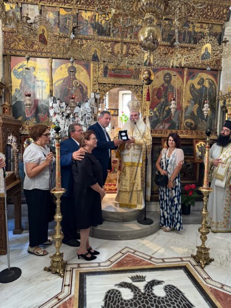 Τιμή και δόξα σε όλους και όλες εσάς, τα απόδημα τέκνα της μάνας Κρήτης, καθώς εξ΄ αιτίας εσάς αυτή η.. ‘άλλη Κρήτη’, ζει στα πέρατα της οικουμένης», κατέληξε ο Σεβ. Μητροπολίτης Κισάμου και Σελίνου κ. Αμφιλόχιος, προσφέροντας στον Πρόεδρο του Παγκοσμίου Συμβουλίου Κρητών κ. Νίκο Καστρινάκη, επετειακό ενθύμημα 50 ετών της Ορθοδόξου Ακαδημίας Κρήτης, ως και επετειακό Τόμο της Αγίας και Μεγάλης Συνόδου της Ορθοδόξου Εκκλησίας. Ακολούθως ο Πρόεδρος του Παγκοσμίου Συμβουλίου Κρητών κ.Καστρινάκης, χαιρέτισε και ευχαρίστησε τον λειτουργό Ιεράρχη κ. Αμφιλόχιο, προσφέροντας τιμητική πλακέτα του Π.Σ.Κ.