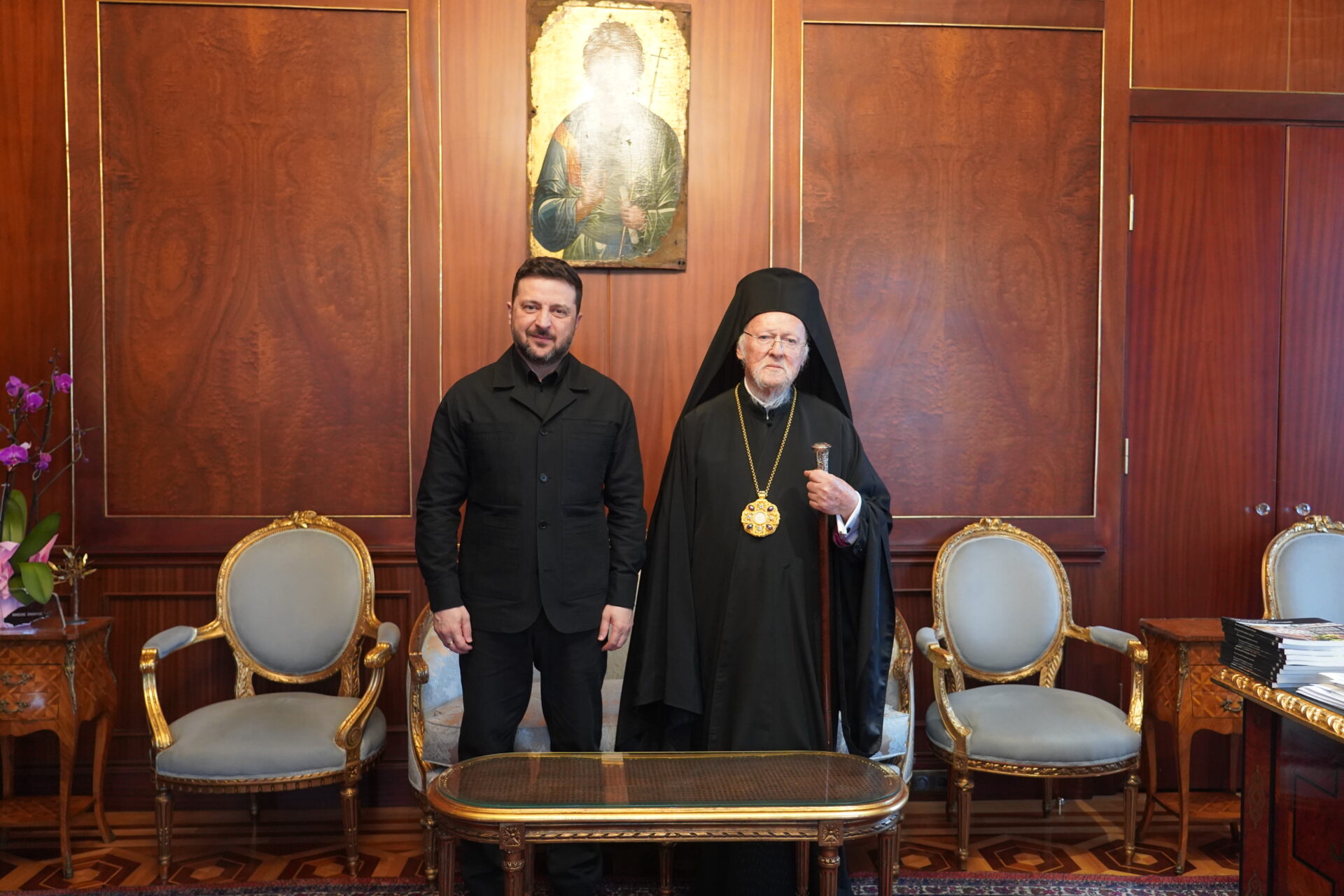 Η Α.Θ. Παναγιότης ο Οικουμενικός Πατριάρχης κ.κ. Βαρθολομαίος, υποδέχθηκε με εγκαρδιότητα τον Πρόεδρο στο Πατριαρχικό Γραφείο και ακολούθως είχαν κατ’ ιδίαν συνάντηση που διήρκησε μία και μισή ώρα, κατά την οποία ο Παναγιώτατος, μεταξύ άλλων, εξέφρασε την υποστήριξή του Οικουμενικού Πατριαρχείου προς τις ειρηνευτικές προσπάθειες, καθώς και το αμείωτο ενδιαφέρον του για τα χιλιάδες απαχθέντα ουκρανόπαιδα, για τα οποία ευχήθηκε σύντομα να επιστρέψουν και να ενωθούν ξανά με τις οικογένειές τους στην Ουκρανία.