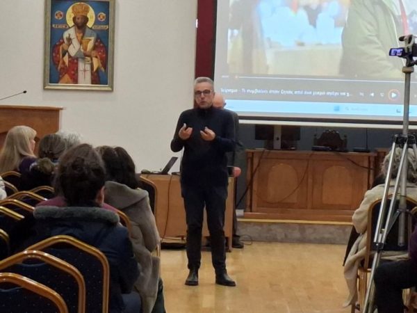 Στη συνέχεια ο κ. Χαρμαντάς ανέπτυξε τη θεματική της μετάβασης από τη μίμηση στην επίγνωση, υπογραμμίζοντας ότι ο άνθρωπος δεν είναι μηχανισμός ούτε απλώς κύτταρα, αλλά Πρόσωπο με δυνατότητα επιλογής. Μέσα από παραδείγματα και βιωματικές αναφορές ανέδειξε τη δύναμη των καθρεπτικών νευρώνων.