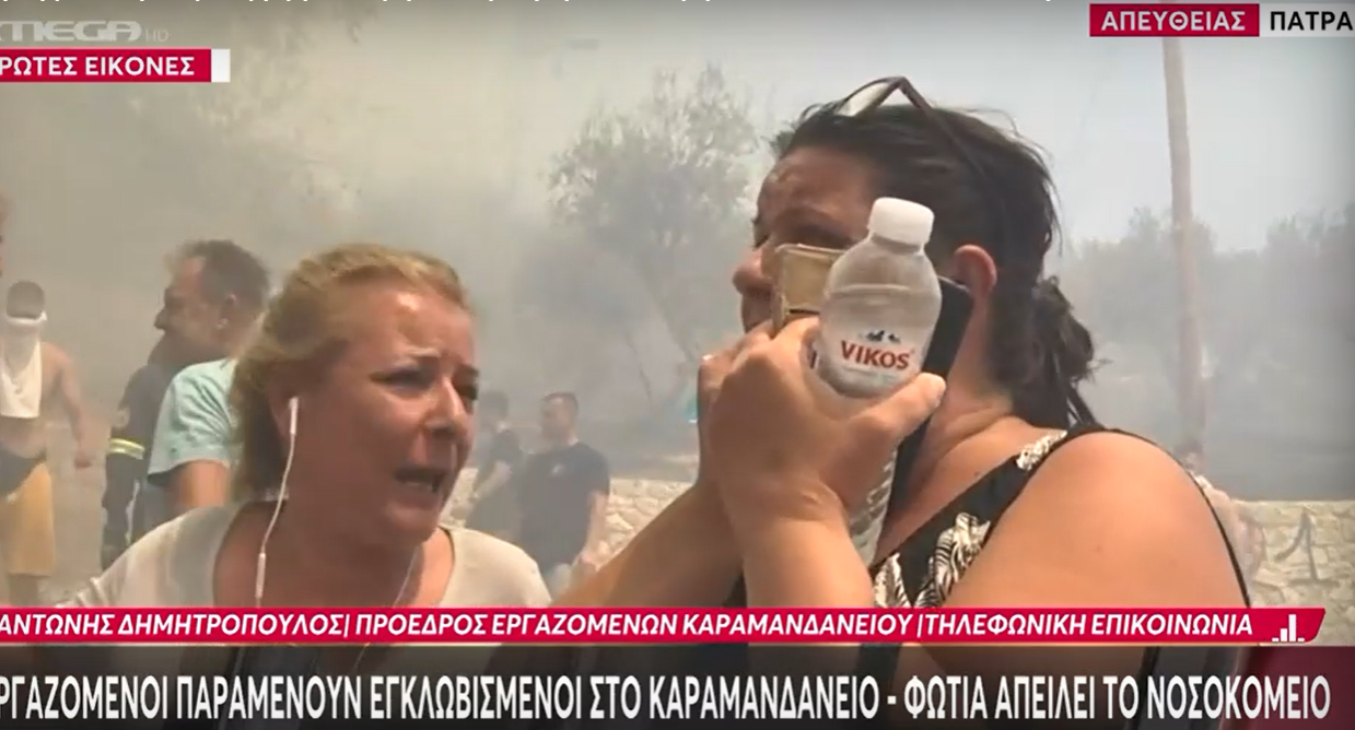 Τις δραματικές στιγμές που εκτυλίχθηκαν έξω από το νοσοκομείο κατέγραψε η κάμερα του Mega. Μάλιστα, στον «αέρα» φάνηκε η απόγνωση μιας γυναίκας που προσπαθούσε να επικοινωνήσει με έναν δικό της άνθρωπο που βρισκόταν πολύ κοντά στη φωτιά.