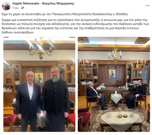 Συνάντηση με τον Μητροπολίτη Θεσσαλονίκης κ. Φιλόθεο είχε ο ευρωβουλευτής και πρώην πρόεδρος της Νέας Δημοκρατίας, Βαγγέλης Μεϊμαράκης.