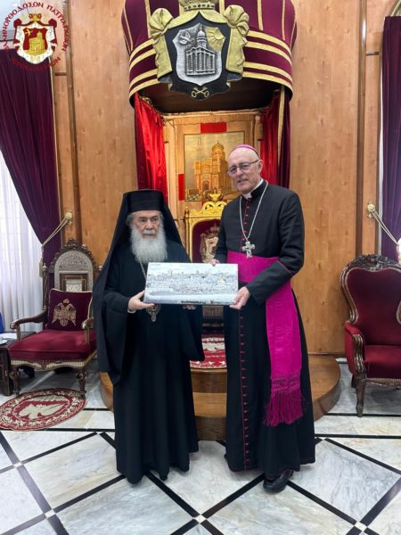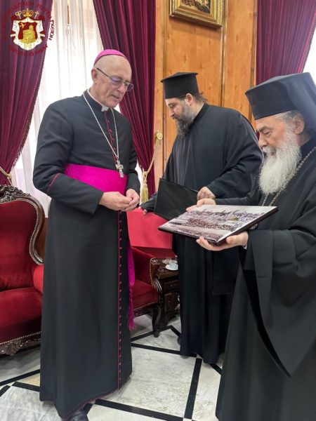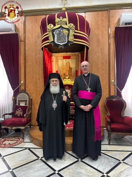 Ο εξοχότατος Σεβασμιώτατος κ. Giorgio Lingua, συνοδευόμενος από τον π. Nikola di Ponzio, επισκέφθηκε τον Μακαριώτατο Πατριάρχη Ιεροσολύμων κ.κ. Θεόφιλο τη Δευτέρα 23 Μαρτίου 2026, με αφορμή την ανάληψη των καθηκόντων του ως νέου Αποστολικού Δελεγάτου (Νούντσιου), δηλαδή εκπροσώπου του Βατικανού στην Αγία Γη.