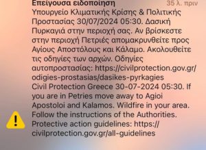 Σύμφωνα με την Πυροσβεστική, το πύρινο μέτωπο βρίσκεται «εσωτερικά» του τριγώνου που σχηματίζουν οι οικισμοί Πετριές, Κριεζά και Αλώνια και κινείται νότια. Οι κάτοικοι των Πετριών έλαβαν νέο μήνυμα από το 112 στις 5:30 το πρωί, με οδηγίες να απομακρυνθούν προς Αγίους Αποστόλους και Κάλαμο.