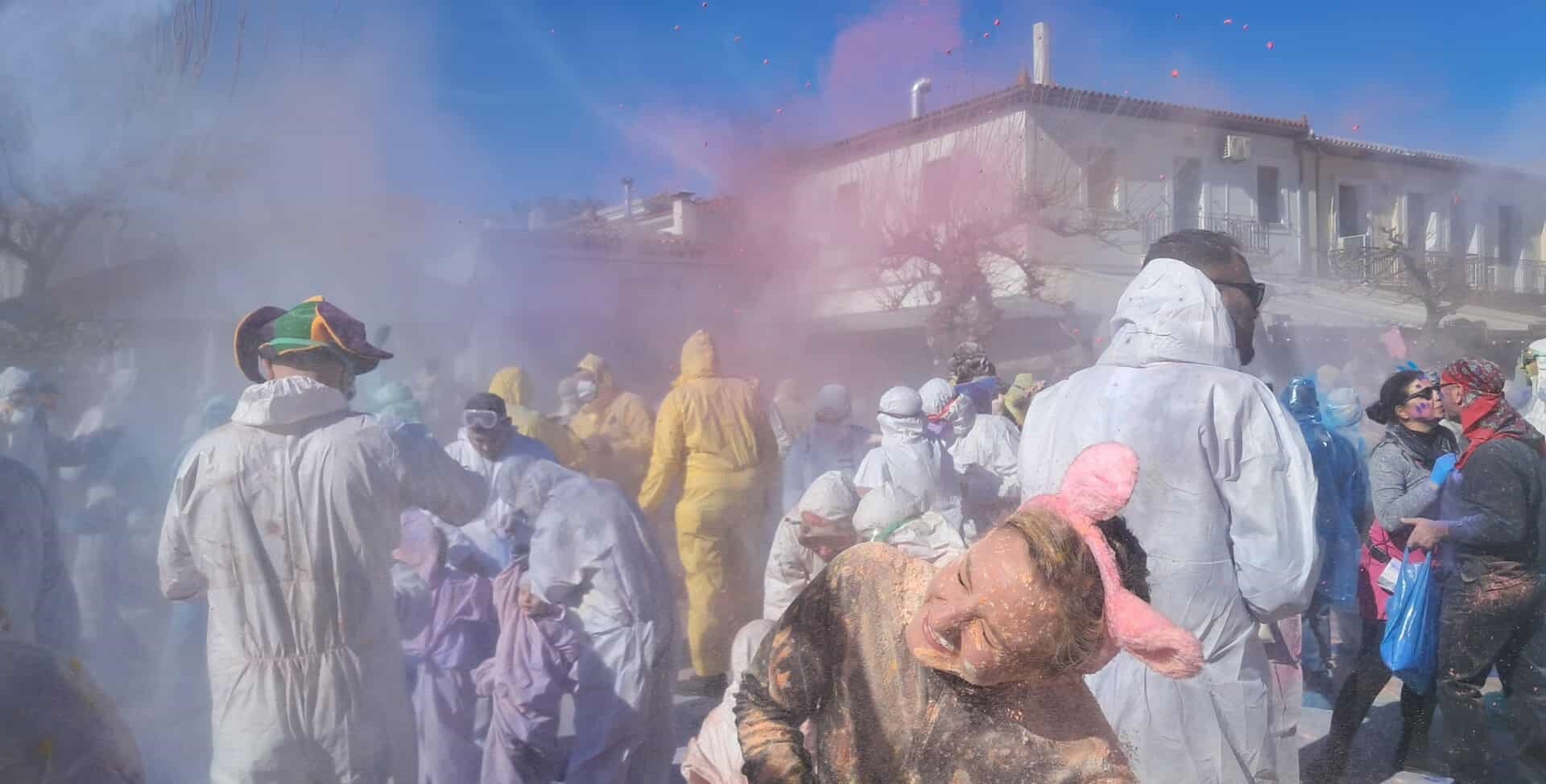 Με αλεύρι, φούμο και φυσικές χρωστικές, έδιναν έναν συμβολικό – αλλά και γιορτινό – τόνο στον αποχωρισμό, κρατώντας ζωντανό το κέφι και την ελπίδα της επιστροφής. Σήμερα, το έθιμο αποτελεί έναν από τους πιο εντυπωσιακούς αποκριάτικους θεσμούς της χώρας. Από νωρίς το μεσημέρι, μικροί και μεγάλοι συγκεντρώθηκαν στο λιμάνι, εξοπλισμένοι με 3.000 σακούλες αλευριού έτοιμοι για «πόλεμο» γεμάτο χαμόγελα, μουσική και χορό.