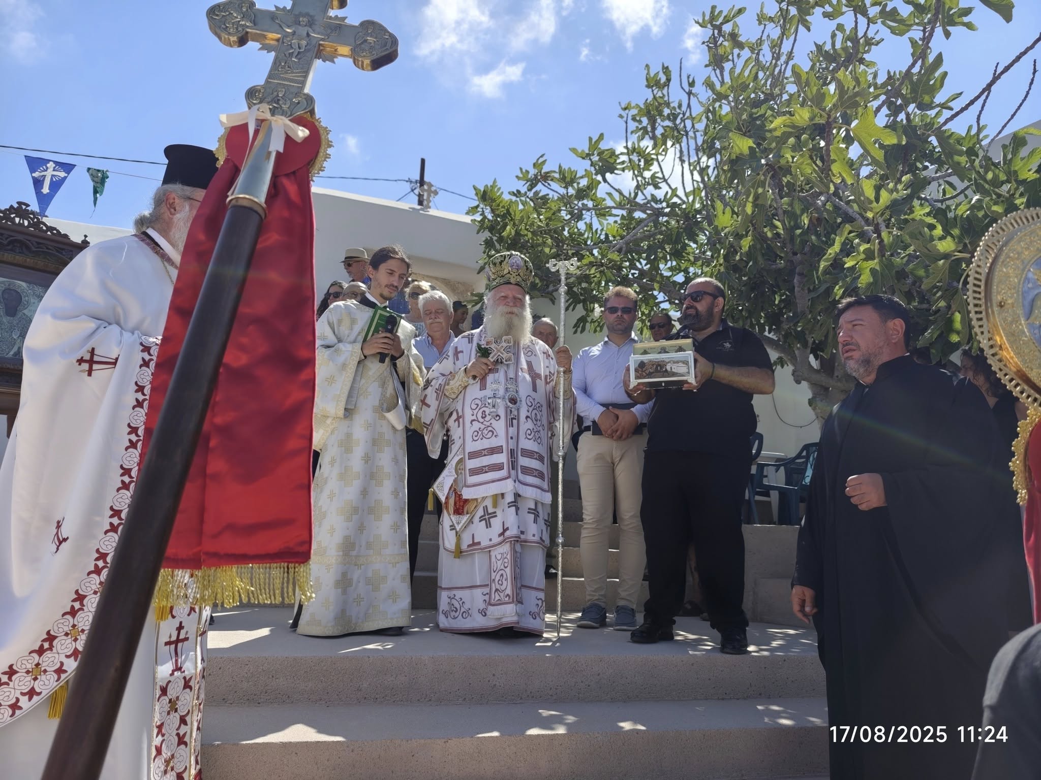 Την κυριώνυμο ημέρα, 17η Αυγούστου, τελέσθηκε λαμπρή Αναστάσιμη Θεία Λειτουργία και ακολούθησε η λιτανεία της Ιεράς Εικόνος και του Ιερού Λειψάνου του Αγ. Μύρωνος έως το σπήλαιο της ευρέσεως όπου τελέσθηκε κατά το έθος ο Αγιασμός. Άμα τη επιστροφή στο Ναό όλο το εκκλησίασμα πέρασε κάτω από την εικόνα του Αγίου σύμφωνα με το τοπικό έθιμο, ενώ ο Σεβ/τος έκανε ιδιαίτερη αναφορά στον επί δεκαετίες επίτροπο Μανώλη Χαρχαλάκη που πριν 3 χρόνια εκοιμήθη και η απώλειά του στο νησί και τους ναούς του είναι παραπάνω από αισθητή.