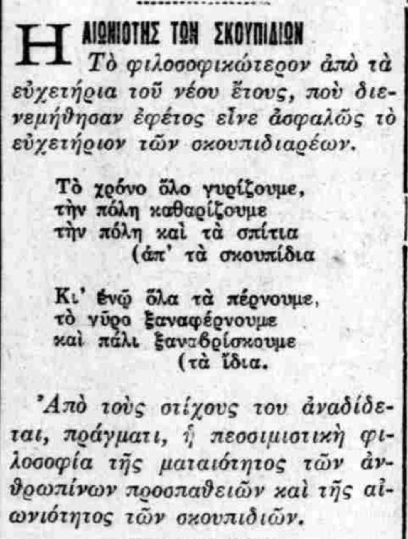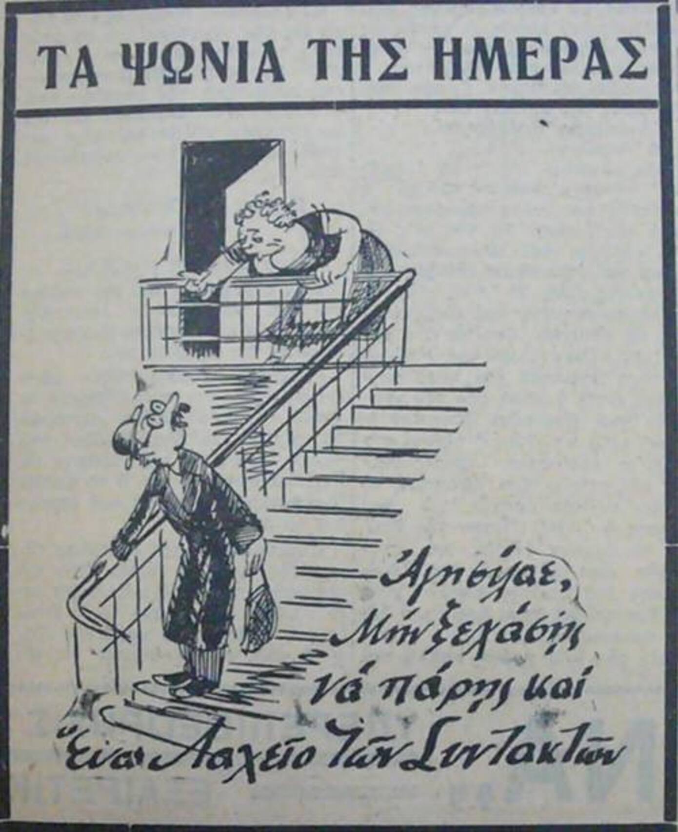 Εξαφανίστηκε και η παλιά συνήθεια να κρεμούν έξω από την πόρτα του σπιτιού, σε μια σακούλα ένα τσουρέκι ή ψωμί για να το πάρουν στα χαράματα -όταν δεν θα τους έβλεπαν- οι φτωχοί. Τα παλιά πρωτοχρονιάτικα γλέντια που ξεσήκωναν τις γειτονιές έγιναν ρεβεγιόν σε κοσμικά εστιατόρια και ξενοδοχεία με συγκεκριμένο μενού -που οπωσδήποτε χρειάζεσαι κάποιον να σε βοηθήσει να καταλάβεις τι θα φας- και ακόμα πιο εξασφαλισμένη βαρεμάρα… Τα ταξιδιωτικά γραφεία κάνουν σήμερα χρυσές δουλειές στέλνοντας χιλιάδες συμπολίτες μας στην επαρχία και στο εξωτερικό για να γλυτώσουν τη «βαβούρα» των εορτών!».