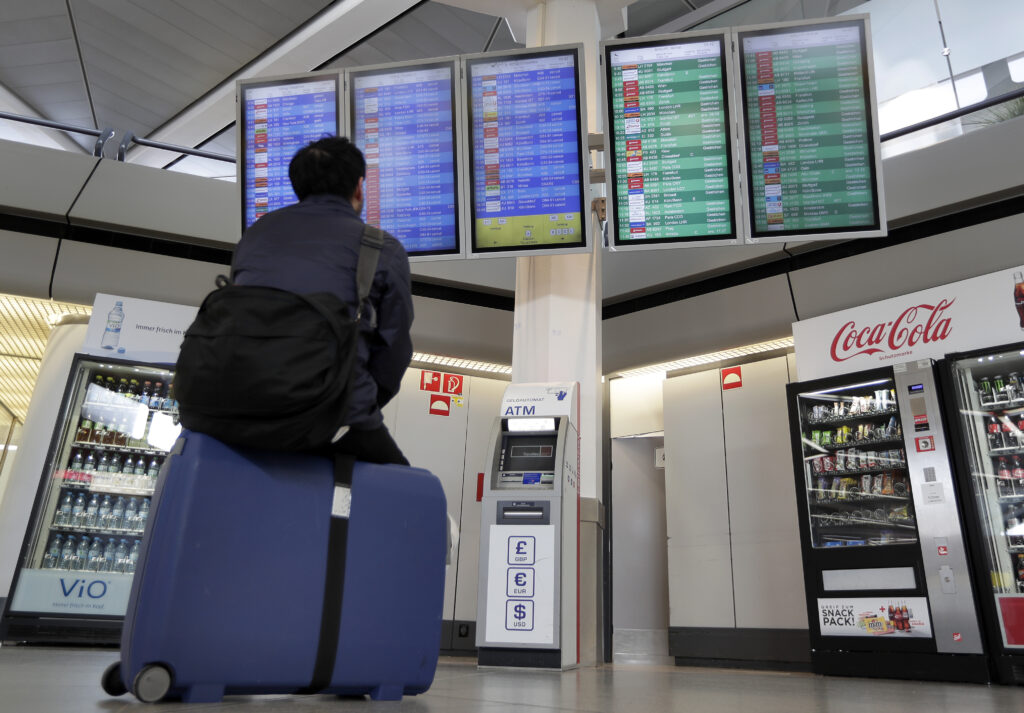 A traveler sits on his suitcase in front of a flight information board during a strike organized by the German ver.di union at the Tegel airport in Berlin, Germany, Monday, March 13, 2017. The union, representing airport ground staff, has called on its members to go on strike again at Berlin’s two airports Tegel and Schoenefeld. (AP Photo/Michael Sohn)