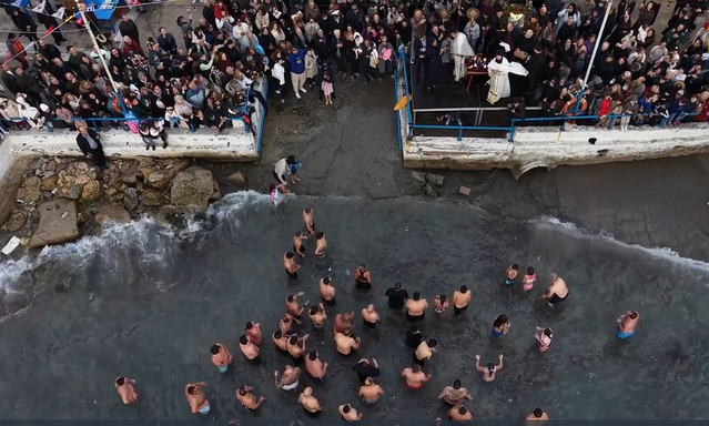Στον γραφικό «Όρμο της Αφροδίτης» (Μπαϊκούτση), η γιορτή δεν έχει ανάγκη από εξέδρες και επισημότητες για να λάμψει. Το σκηνικό ήταν κι αυτή τη χρονιά μοναδικό: Το μικρό εκκλησάκι του Αγίου Νικολάου, ο επιβλητικός πέτρινος Σταυρός του Αφανούς Ναύτη και η θάλασσα που αγκαλιάζει τα βράχια. Εκεί, στο «Σκαφάκι», πλήθος πιστών συνέρρευσε μετά τη Λειτουργία, ακολουθώντας την πομπή για να ζήσει τον Αγιασμό των Υδάτων σε ένα περιβάλλον που θυμίζει νησί.
