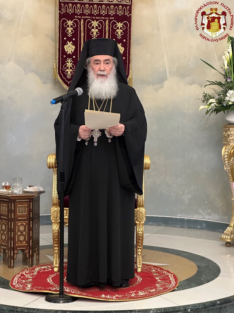 Προσευχηθέντες ὑπέρ ὑγιείας καί εὐσταθείας τῆς Ὑμετέρας σεπτῆς Μακαριότητος εἰς «τό σκήνωμα τῆς δόξης Κυρίου», ὡς χαρακτηρίζει ὁ ὑμνῳδός τόν Ναόν τῆς Ἀναστάσεως, συναζόμεθα νῦν εἰς τό ἱερόν τοῦτο «ὀσπίτιον», ὡς χαρακτηρίζει τήν ἱστορικήν ταύτην αἴθουσαν τοῦ Πατριαρχείου ὁ πολύς ἐν Πατριάρχαις Ἱεροσολύμων Δοσίθεος, ἵνα ἀπονείμωμεν τῇ Ὑμετέρᾳ Μακαριότητι τόν συγχαρητήριον ἔπαινον, δι΄ὅσα Αὕτη εὐεργετικά καί ὠφέλιμα ὑπέρ τοῦ Πατριαρχείου καί τῆς Ἀδελφότητος ἔπραξε καί συνεχίζει νά πράττῃ.