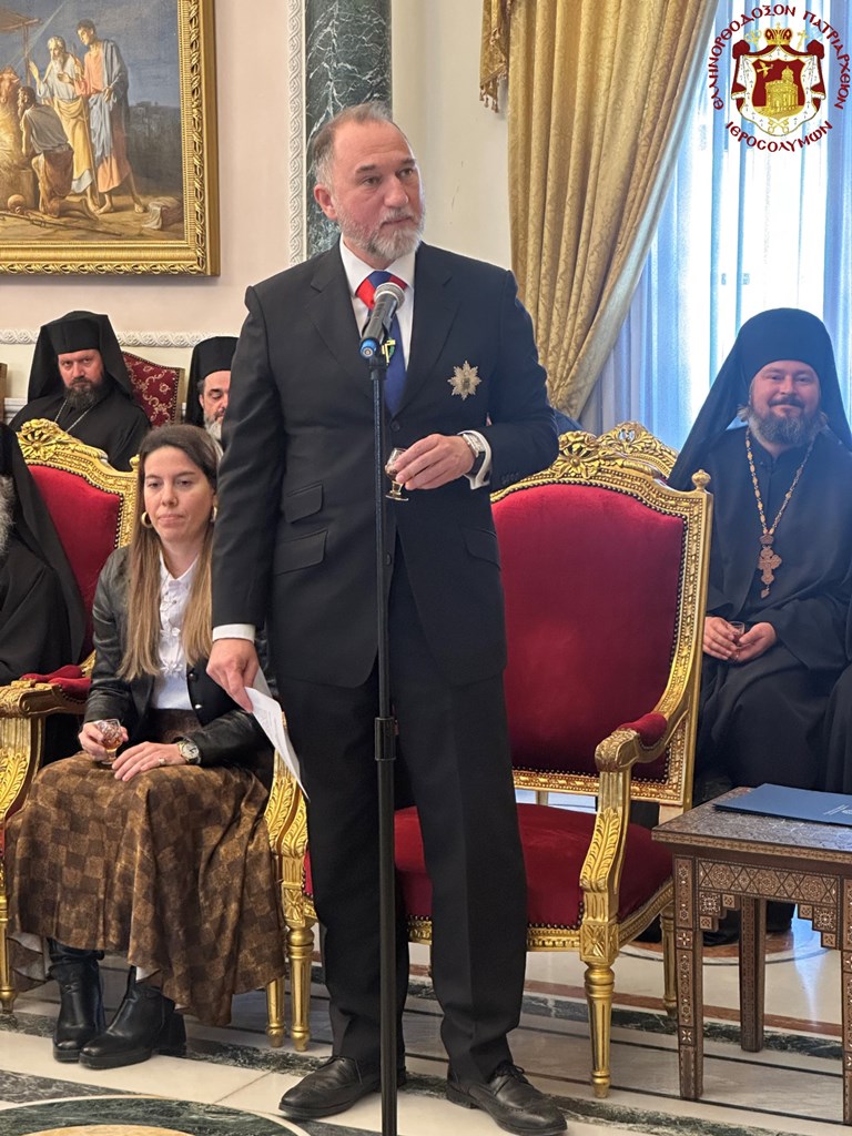 Από τη μεριά του ο Γενικός Πρόξενος της Ελλάδας στα Ιεροσόλυμα, ο οποίος παραβρέθηκε στη εορτή, προσφωνώντας τον Μακαριώτατο σημείωσε: “Επί δυόμιση έτη, η περιοχή μας συνταράσσεται από διαδοχικές κλιμακώσεις της ατέρμονος πολεμικής συγκρούσεως, οι οποίες όχι μόνο έχουν εξάψει την βία και τον ανθρώπινο πόνο, ιδίως στους ταραγμένους Αγίους Τόπους, αλλά απειλούν πλέον τα θεμέλια της διεθνούς έννομης τάξης και την συνύπαρξη στηριγμένη σε αρχές και κανόνες δικαίου. Στο επικίνδυνο αυτό περιβάλλον, η στάση και η φωνή της Υμετέρας Μακαριότητος και το έργο του Πατριαρχείου αποτελούν οδηγό προς την λογική, την συμπόνοια, την καταλλαγή και την ειρήνη. Σας ευχαριστούμε για το παράδειγμα θάρρους, σθένους, εγκαρτέρησης και νηφαλιότητας. Είμαστε υπερήφανοι να ενώνουμε την φωνή μας με την δική Σας και να στεκόμαστε στο πλευρό του Πατριαρχείου, της Αδελφότητας και των εδώ χριστιανικών κοινοτήτων. Και παρά τις δύσκολες αυτές ώρες και τους περιορισμούς, στο πλευρό σας θα εορτάσουμε σύντομα το άγιο Πάσχα“.