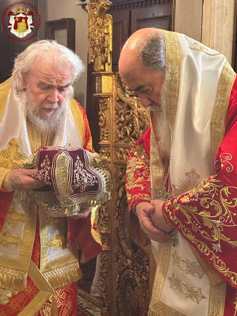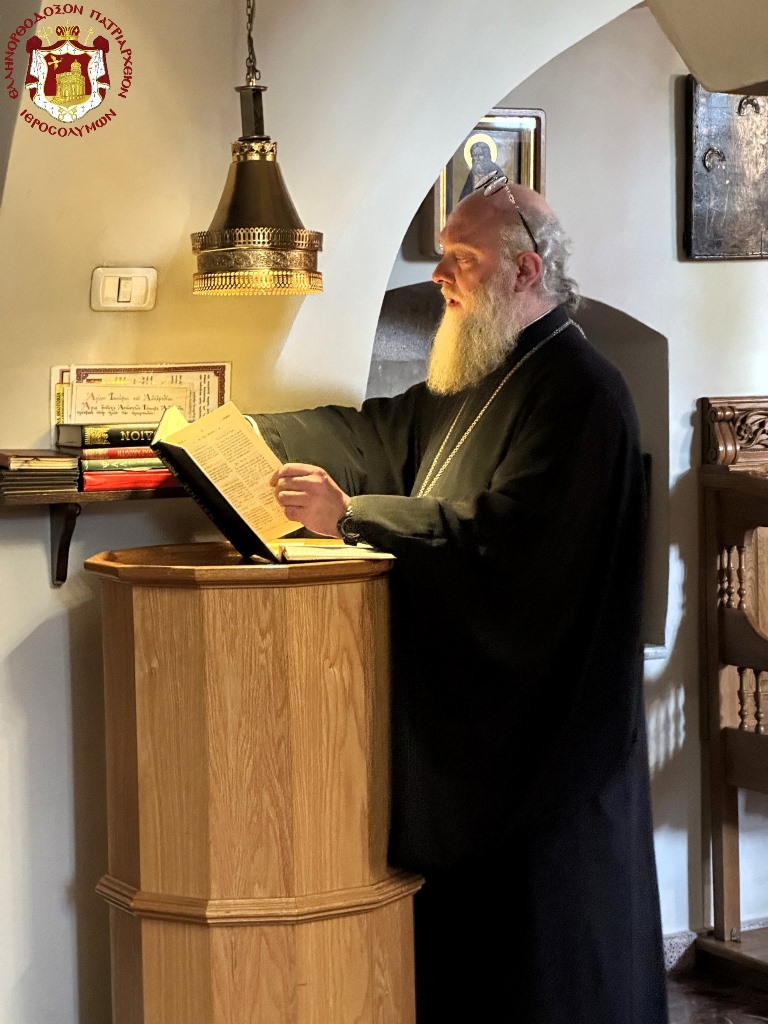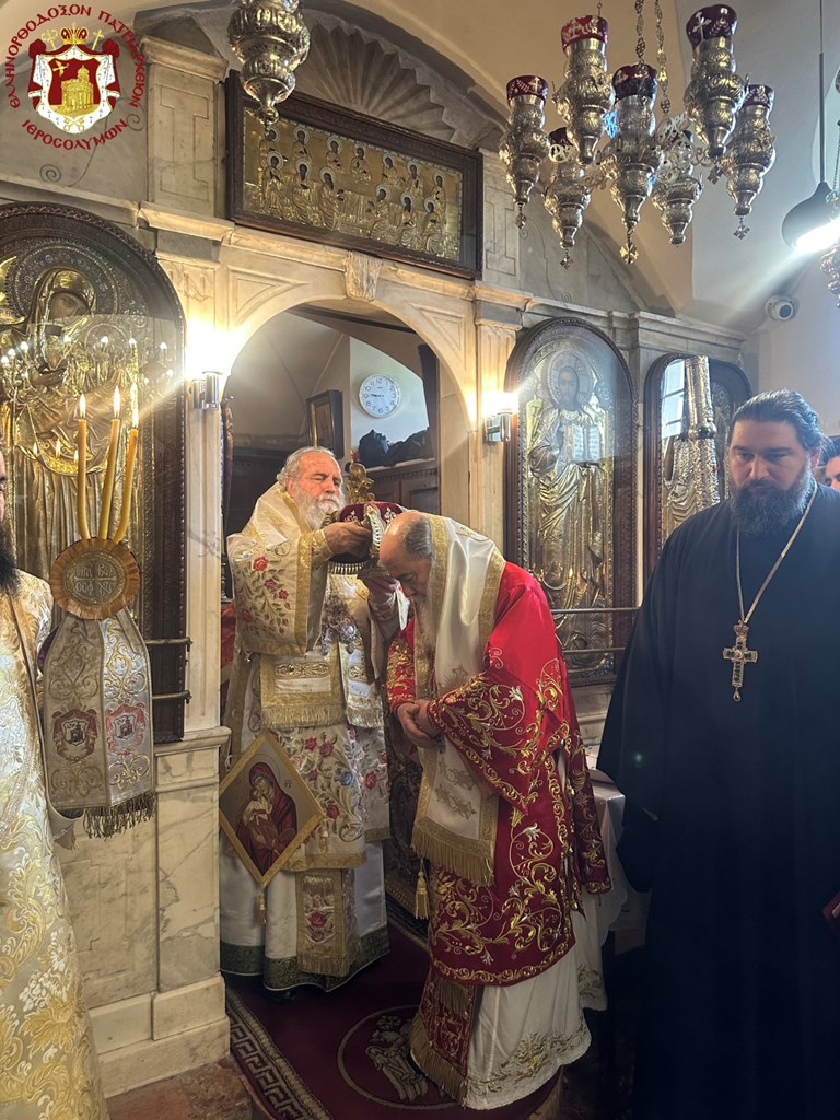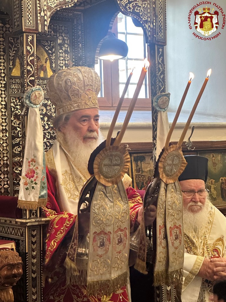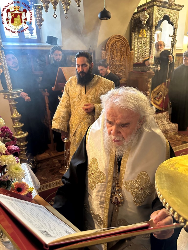 Ὡσαύτως ἑωρτάσθη διά θ. Λειτουργίας τὴν πρωΐαν εἰς τὸν αὑτὸν Ἱερὸν Ναόν, λειτουργοῦντος τοῦ Μακαριωτάτου καὶ συλλειτουργούντων τῶν Σεβασμιωτάτων Μητροπολιτῶν Ναζαρέτ κ. Κυριακοῦ καί Καπιτωλιάδος κ. Ἡσυχίου, τοῦ Γέροντος Ἀρχιγραμματέως Σεβασμιωτάτου Ἀρχιεπισκόπου Κωνσταντίνης κ. Ἀριστάρχου καὶ τῶν ἐφημερίων τοῦ Ναοῦ, τοῦ Τυπικάρη Ἀρχιμανδρίτου π. Ἀλεξίου, τοῦ Ἀρχιμανδρίτου π. Συμεών καί τοῦ ἐκπροσώπου τοῦ Πατριαρχείου τῆς Ρουμανίας Ἀρχιμανδρίτου π. Ἰωάννου καί ἐκπροσώπων τοῦ Πατριαρχείου τῆς Ρωσίας, τοῦ Ἀρχιδιακόνου π. Μάρκου καί τοῦ Ἱεροδιακόνου π. Προδρόμου, τῇ τιμητικῇ παρουσίᾳ τοῦ Γενικοῦ Προξένου τῆς Ἑλλάδος εἰς τὰ Ἱεροσόλυμα κ. Δημητρίου Ἀγγελοσοπούλου καί τῆς Προξένου κ. Ἄννης Μάντικα καὶ ὀλίγων πιστῶν, τῶν δυνηθέντων νά ὑπερβοῦν τὰς ἀντιξόους περιστάσεις τοῦ πολέμου καὶ νά προσέλθουν.