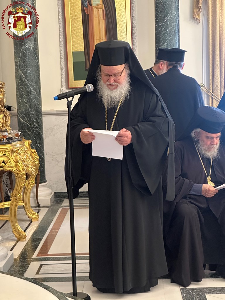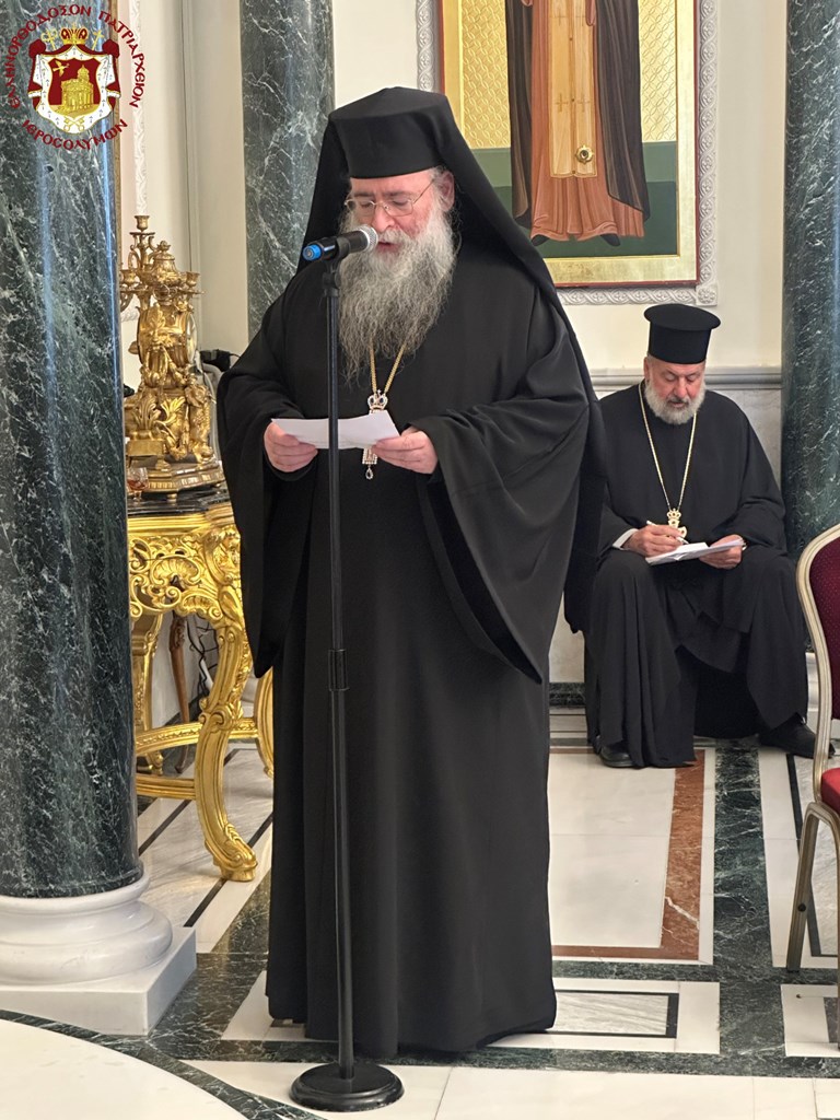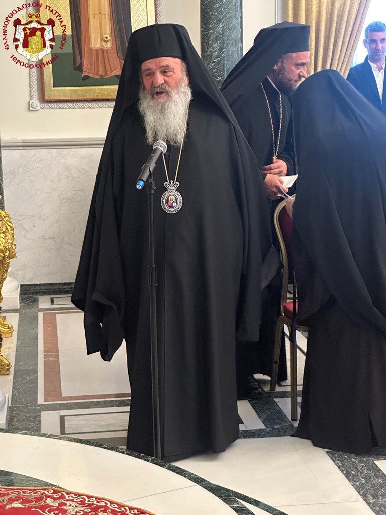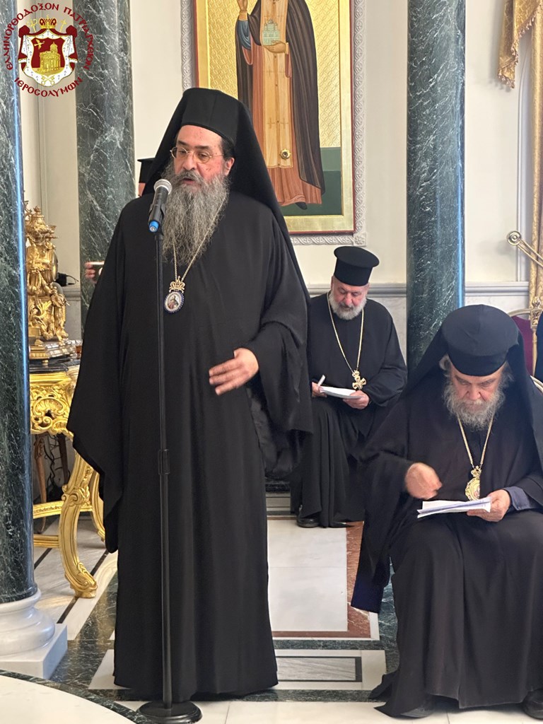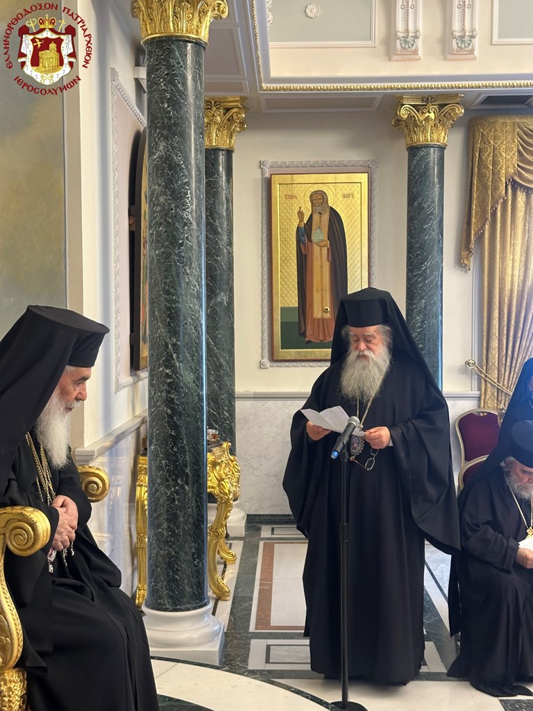 Προσευχηθέντες ὑπέρ ὑγιείας καί εὐσταθείας τῆς Ὑμετέρας σεπτῆς Μακαριότητος εἰς «τό σκήνωμα τῆς δόξης Κυρίου», ὡς χαρακτηρίζει ὁ ὑμνῳδός τόν Ναόν τῆς Ἀναστάσεως, συναζόμεθα νῦν εἰς τό ἱερόν τοῦτο «ὀσπίτιον», ὡς χαρακτηρίζει τήν ἱστορικήν ταύτην αἴθουσαν τοῦ Πατριαρχείου ὁ πολύς ἐν Πατριάρχαις Ἱεροσολύμων Δοσίθεος, ἵνα ἀπονείμωμεν τῇ Ὑμετέρᾳ Μακαριότητι τόν συγχαρητήριον ἔπαινον, δι΄ὅσα Αὕτη εὐεργετικά καί ὠφέλιμα ὑπέρ τοῦ Πατριαρχείου καί τῆς Ἀδελφότητος ἔπραξε καί συνεχίζει νά πράττῃ.