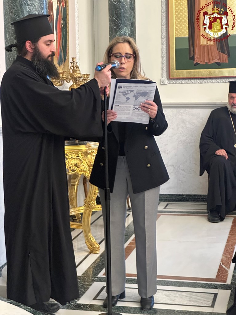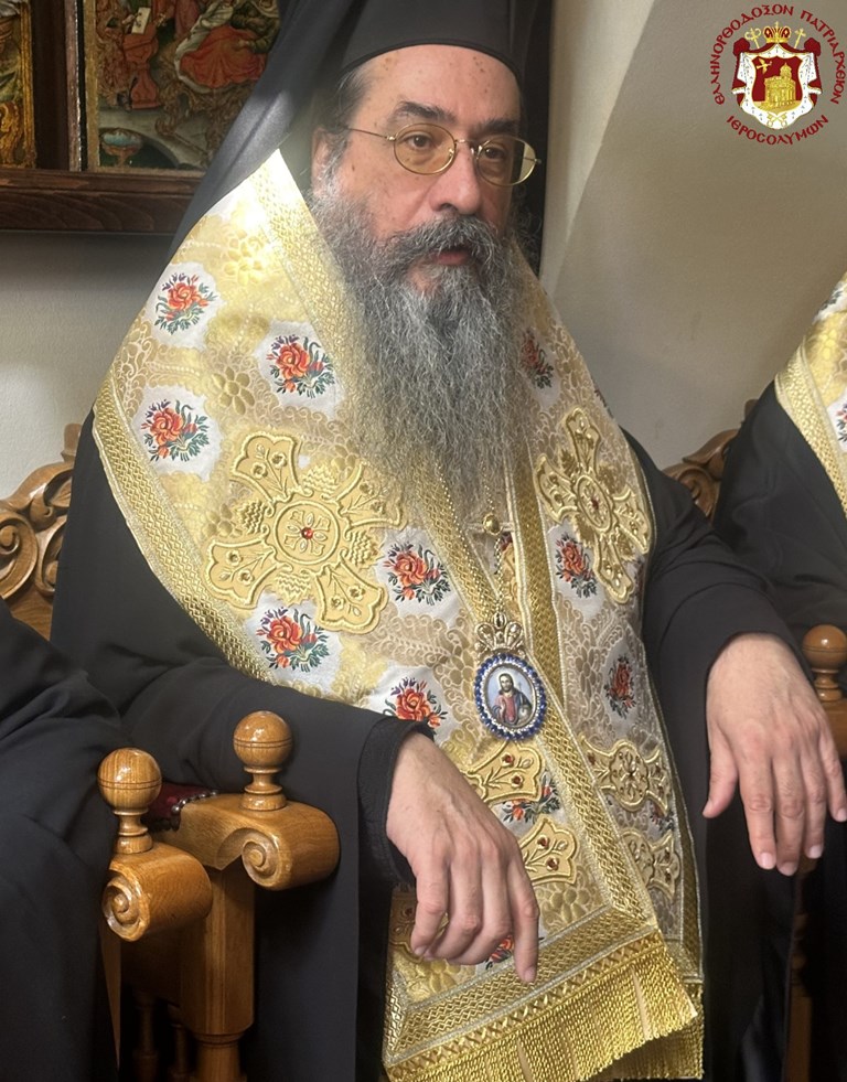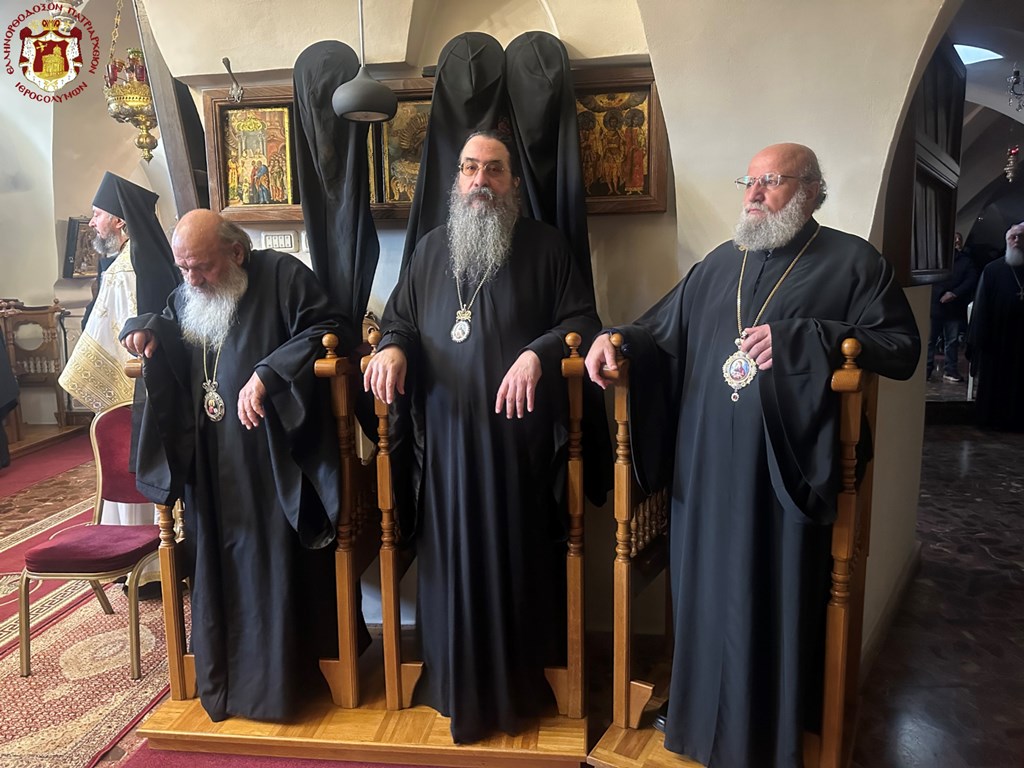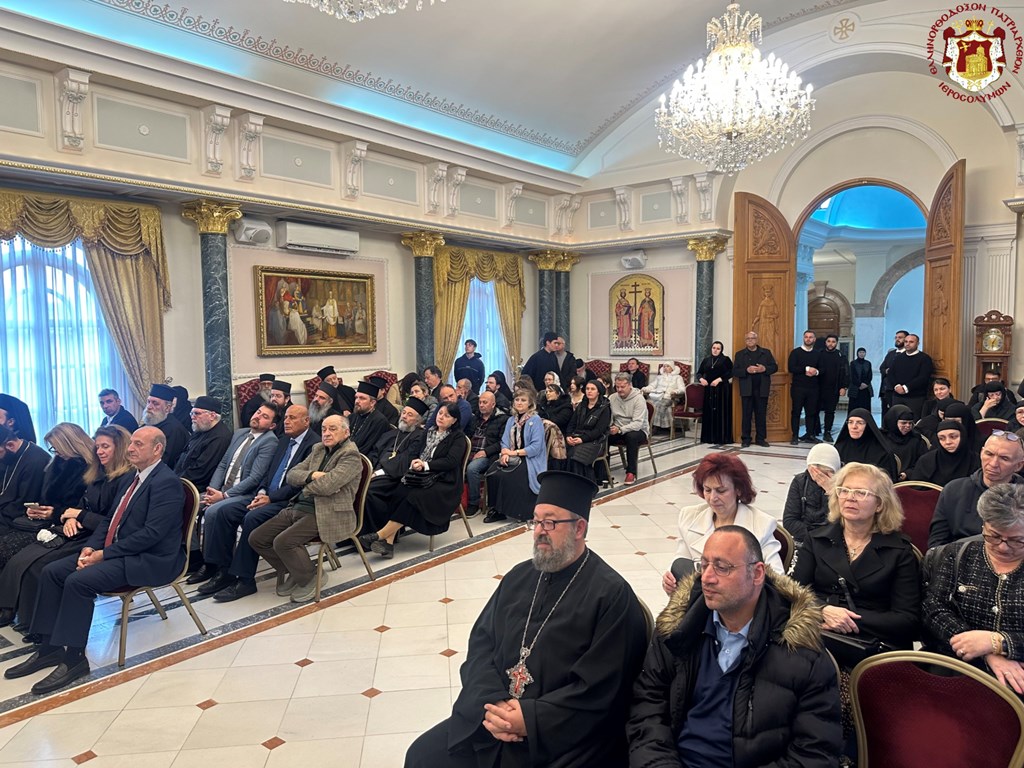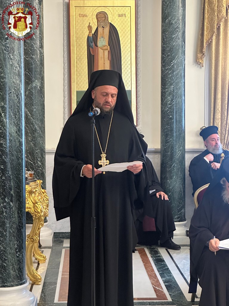 Προσευχηθέντες ὑπέρ ὑγιείας καί εὐσταθείας τῆς Ὑμετέρας σεπτῆς Μακαριότητος εἰς «τό σκήνωμα τῆς δόξης Κυρίου», ὡς χαρακτηρίζει ὁ ὑμνῳδός τόν Ναόν τῆς Ἀναστάσεως, συναζόμεθα νῦν εἰς τό ἱερόν τοῦτο «ὀσπίτιον», ὡς χαρακτηρίζει τήν ἱστορικήν ταύτην αἴθουσαν τοῦ Πατριαρχείου ὁ πολύς ἐν Πατριάρχαις Ἱεροσολύμων Δοσίθεος, ἵνα ἀπονείμωμεν τῇ Ὑμετέρᾳ Μακαριότητι τόν συγχαρητήριον ἔπαινον, δι΄ὅσα Αὕτη εὐεργετικά καί ὠφέλιμα ὑπέρ τοῦ Πατριαρχείου καί τῆς Ἀδελφότητος ἔπραξε καί συνεχίζει νά πράττῃ.