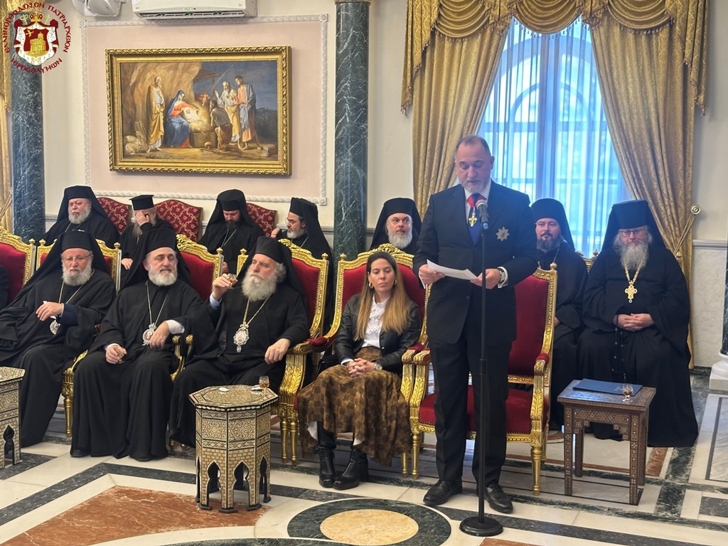 Από τη μεριά του ο Γενικός Πρόξενος της Ελλάδας στα Ιεροσόλυμα, ο οποίος παραβρέθηκε στη εορτή, προσφωνώντας τον Μακαριώτατο σημείωσε: “Επί δυόμιση έτη, η περιοχή μας συνταράσσεται από διαδοχικές κλιμακώσεις της ατέρμονος πολεμικής συγκρούσεως, οι οποίες όχι μόνο έχουν εξάψει την βία και τον ανθρώπινο πόνο, ιδίως στους ταραγμένους Αγίους Τόπους, αλλά απειλούν πλέον τα θεμέλια της διεθνούς έννομης τάξης και την συνύπαρξη στηριγμένη σε αρχές και κανόνες δικαίου. Στο επικίνδυνο αυτό περιβάλλον, η στάση και η φωνή της Υμετέρας Μακαριότητος και το έργο του Πατριαρχείου αποτελούν οδηγό προς την λογική, την συμπόνοια, την καταλλαγή και την ειρήνη. Σας ευχαριστούμε για το παράδειγμα θάρρους, σθένους, εγκαρτέρησης και νηφαλιότητας. Είμαστε υπερήφανοι να ενώνουμε την φωνή μας με την δική Σας και να στεκόμαστε στο πλευρό του Πατριαρχείου, της Αδελφότητας και των εδώ χριστιανικών κοινοτήτων. Και παρά τις δύσκολες αυτές ώρες και τους περιορισμούς, στο πλευρό σας θα εορτάσουμε σύντομα το άγιο Πάσχα“.
