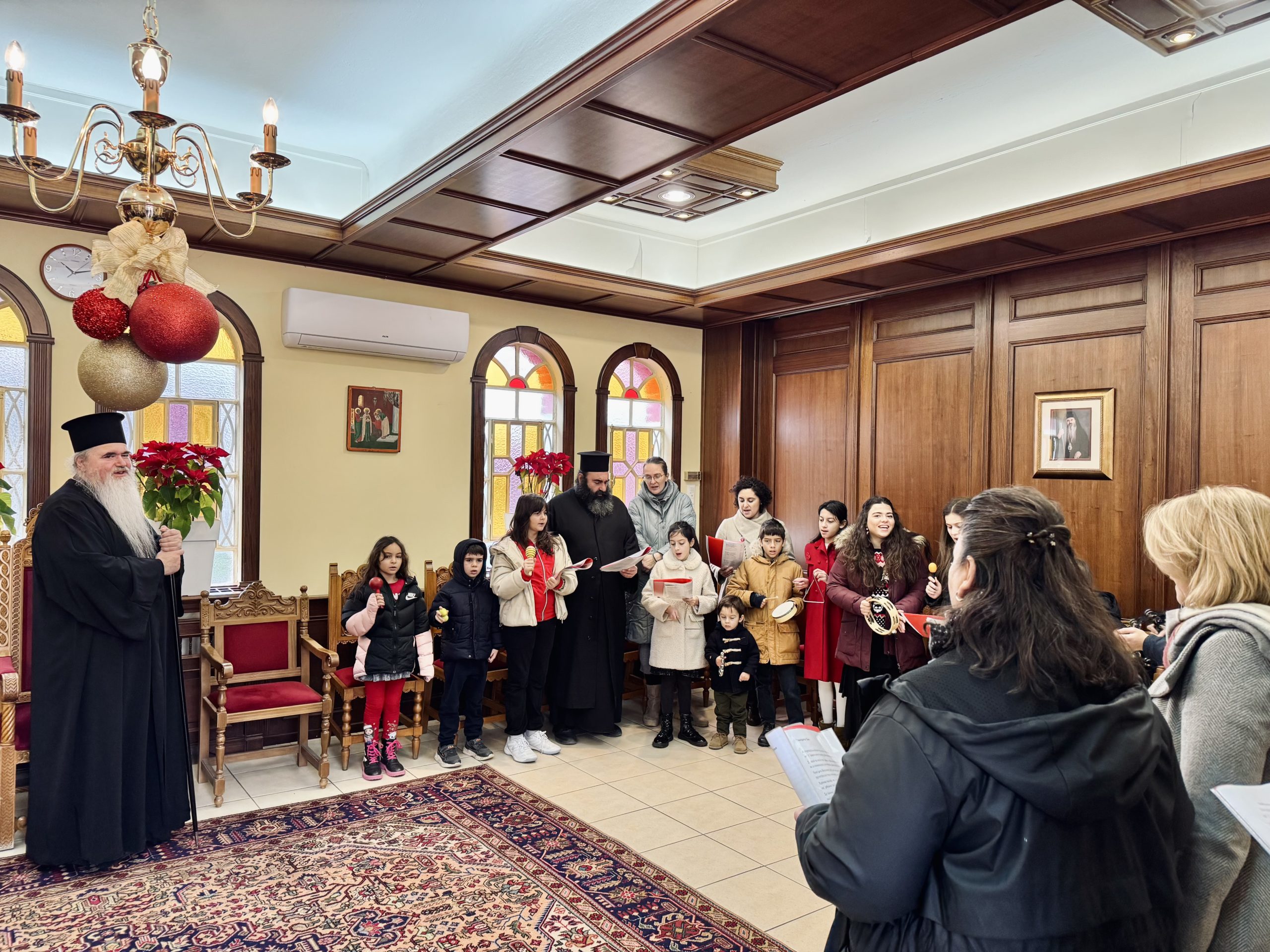 Μικρά παιδιά, καθώς και εκπρόσωποι πολιτιστικών συλλόγων και φορέων της περιοχής, τραγούδησαν τα παραδοσιακά κάλαντα και ευχήθηκαν στον οικείο ποιμενάρχη υγεία, ευλογία και καλοχρονία.