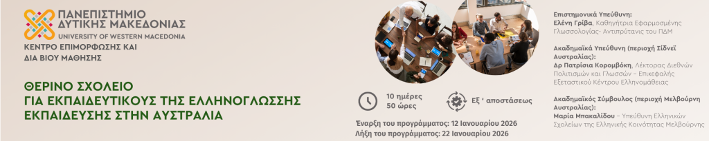 Την πρωτοβουλία υλοποιεί το Κέντρο Επιμόρφωσης και Δια Βίου Μάθησης του Πανεπιστημίου Δυτικής Μακεδονίας, με στόχο την ενίσχυση και στήριξη των εκπαιδευτικών που κρατούν ζωντανή την ελληνική γλώσσα και τον πολιτισμό στη διασπορά.