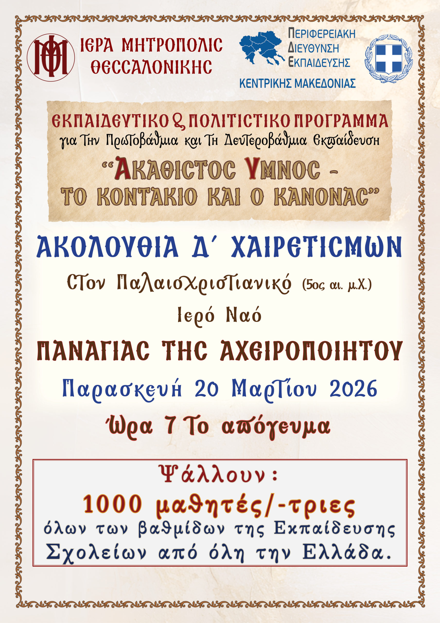 Στο πλαίσιο του Β΄ μέρους του Προγράμματος, σήμερα το απόγευμα, Παρασκευή 20 Μαρτίου 2026 και ώρα 19:00, οι συμμετέχοντες μαθητές θα ψάλλουν την Ακολουθία της Δ’ Στάσεως των Χαιρετισμών στον παλαιοχριστιανικό Ιερό Ναό Παναγίας της Αχειροποιήτου, υπό τον συντονισμό και την καθοδήγηση της Παιδικής και Νεανικής Βυζαντινής Χορωδίας «Ακαδημία Ψαλτικής Ειρμός» της Ιεράς Μητροπόλεως Θεσσαλονίκης.