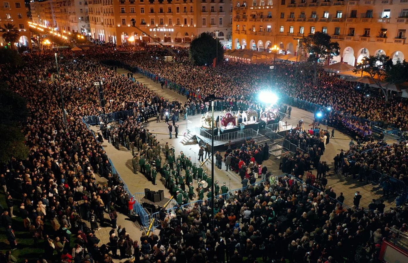 Σε ένα απέραντο σκηνικό κατάνυξης μετατράπηκε το ιστορικό κέντρο της Θεσσαλονίκης, με πλήθος κόσμου και χιλιάδες πιστούς να ακολουθούν τις περιφορές των Επιταφίων που κατέληξαν στην πλατεία Αριστοτέλους, όπου για τρίτη συνεχή χρονιά αντάμωσαν πέντε Επιτάφιοι από ναούς της πόλης, κορυφώνοντας τη συγκίνηση και τη συμμετοχή.