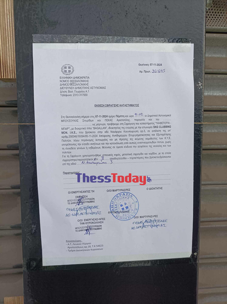 «Σφραγίζεται το κλαμπ λόγω παράνομης λειτουργίας και μη τήρησης της κείμενης νομοθεσίας των ΚΥΕ, επιτρέποντας σε ανήλικους την κατανάλωση οινοπνευματωδών ποτών χωρίς τη συνοδεία ενηλίκων, θέτοντας σε άμεσο κίνδυνο την ασφάλεια της νεολαίας και των πολιτών», αναφέρεται στο σχετικό έγγραφο που ανάρτησε ο δήμος Θεσσαλονίκης.