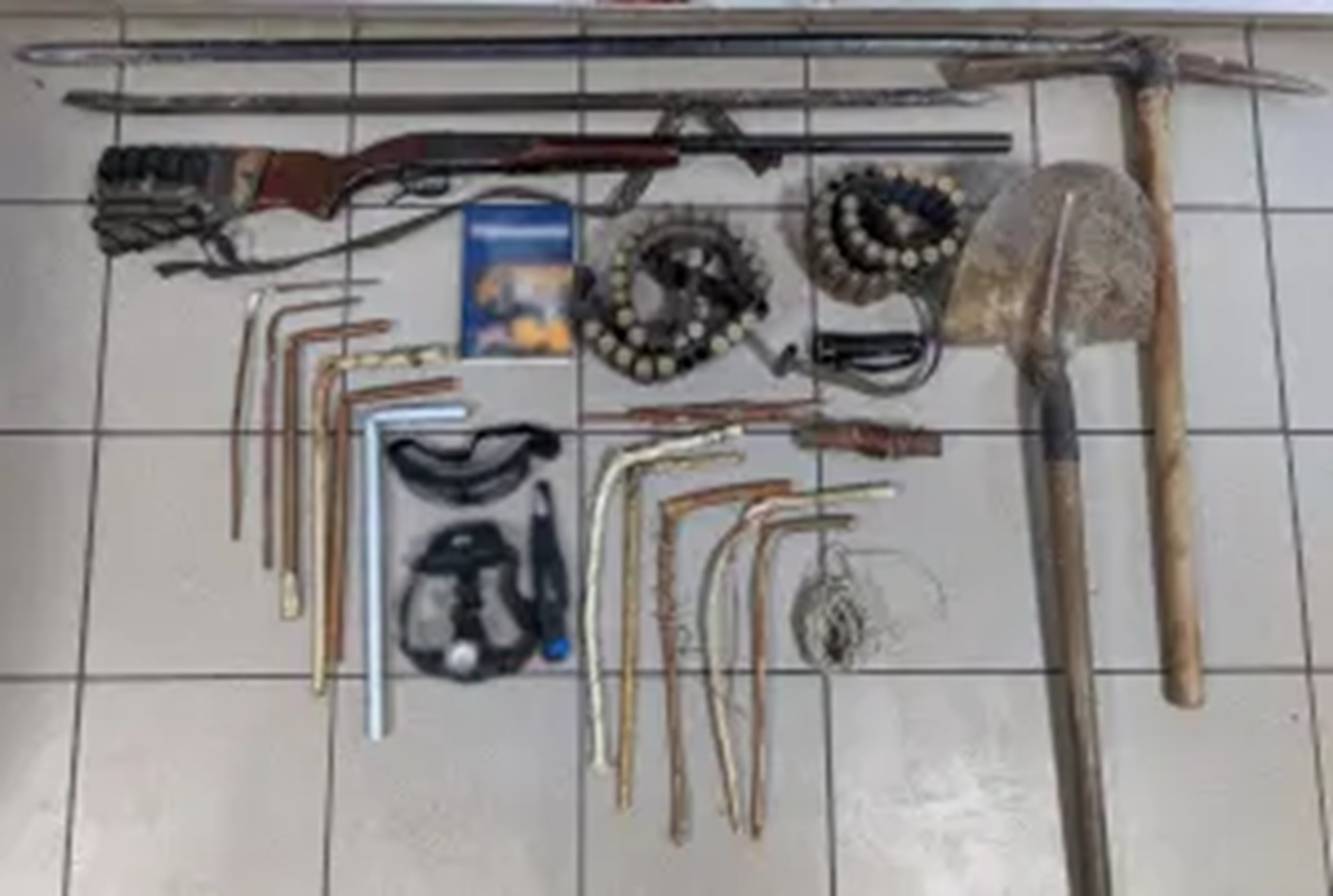 Στη συνέχεια, συνελήφθησαν στο πλαίσιο αστυνομικής επιχείρησης, ενώ σε έρευνες που πραγματοποιήθηκαν στον χώρο, σε οικίες των κατηγορουμένων, όπως και σε σωματικές έρευνες, βρέθηκαν και κατασχέθηκαν εργαλεία πρόσφορα για ανασκαφές – φτυάρι, αξίνα και δύο μεταλλικοί λοστοί – κυνηγετική καραμπίνα με πενήντα φυσίγγια και μαχαίρι, αυτοσχέδιες ξύλινες και μεταλλικές ράβδοι διασκόπησης υπεδάφους, φακός κεφαλής, φακός, καλώδια, ζεύγος προστατευτικών γυαλιών εργασίας και βιβλίο ραβδοσκοπίας.