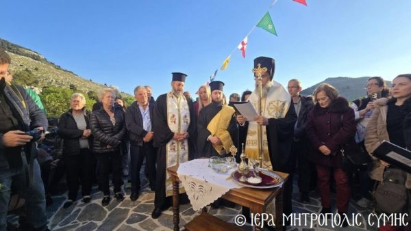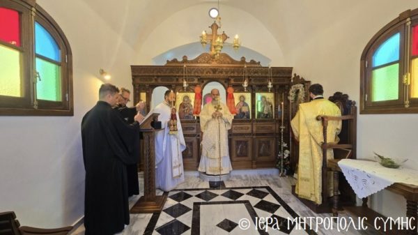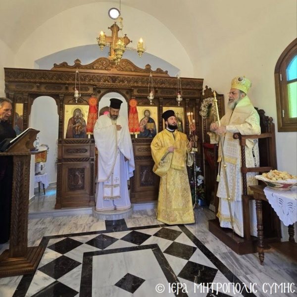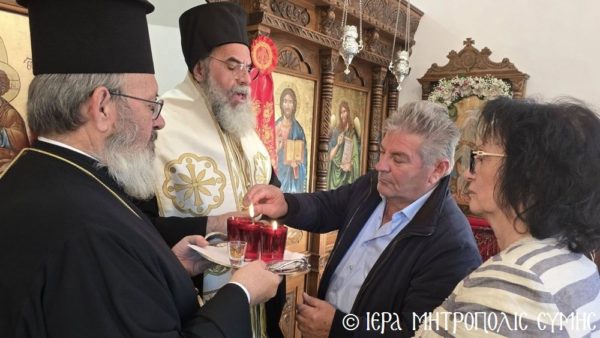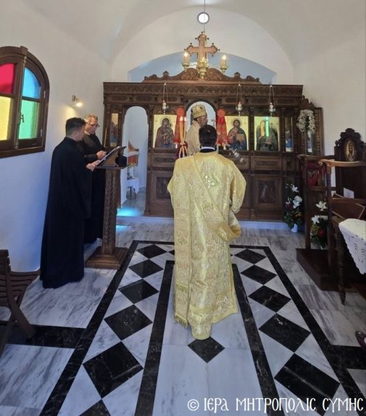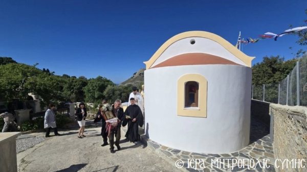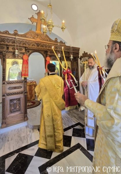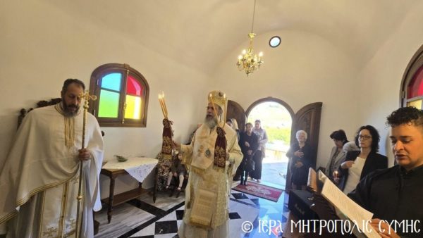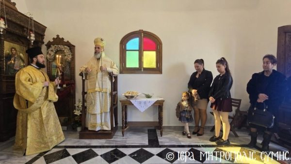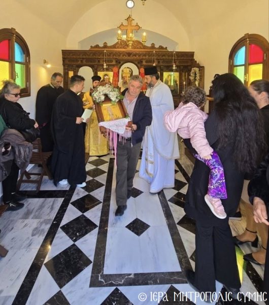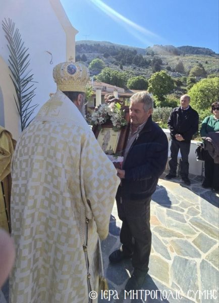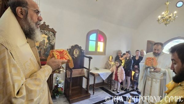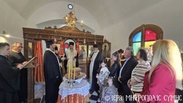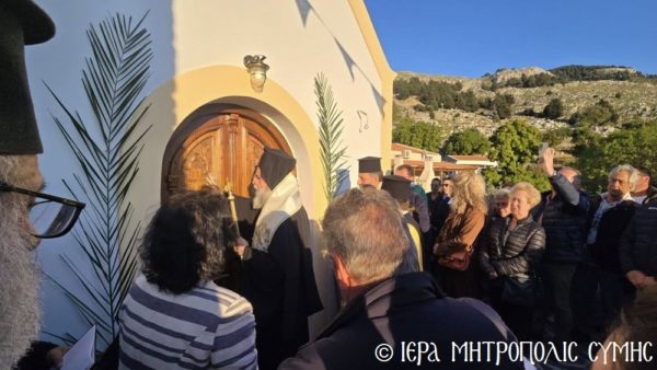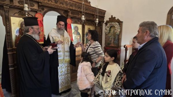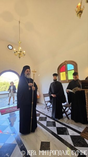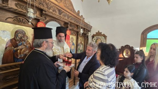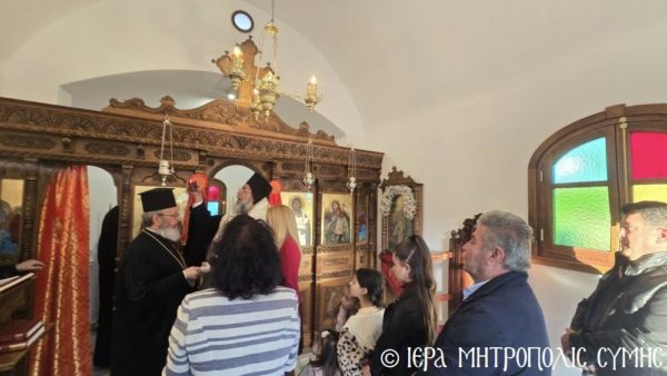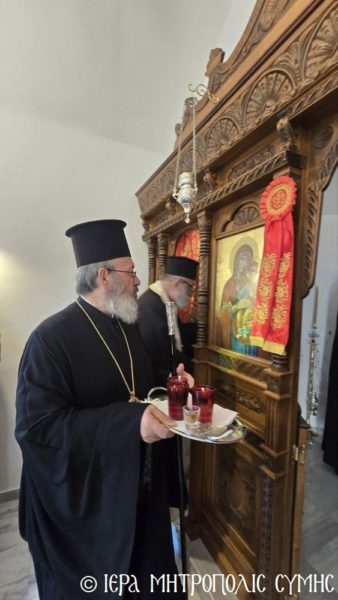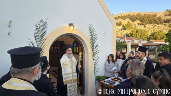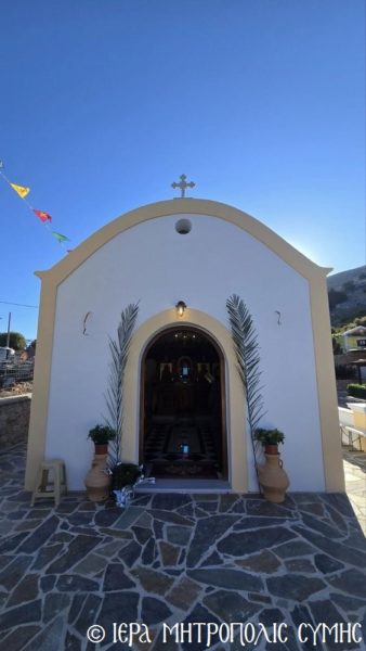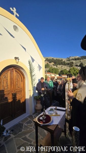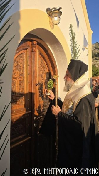 Το περικαλλές αυτό Ιερό Ναύδριο, ανηγέρθη με μέριμνα και δαπάνη της ευσεβούς αυτής οικογενείας και παραδόθηκε στην Θεία Λατρεία του εν Τριάδι Θεού, διά της τελέσεως των Θυρανοιξίων εκ του Σεβασμιωτάτου Μητροπολίτου Σύμης, Τήλου, Χάλκης και Καστελλορίζου κ. Χρυσοστόμου, εχθές το απόγευμα, Κυριακή του Θωμά, 19η Απριλίου 2026. Ο Σεβασμιώτατος ετέλεσε την Ιερά Ακολουθία των Θυρανοιξίων, συμπαραστατούμενος υπό του Θεοφιλεστάτου Βοηθού Αυτού, Επισκόπου Ροδοστόλου κ. Αντωνίου, του Αιδεσ. Πρωτοπρεσβυτέρου Στεφάνου Μακρή, Γενικού Αρχιερατικού Επιτρόπου, του Αιδεσ. Πρεσβυτέρου Αντωνίου Μανιά, Εφημερίου της Ενορίας Ευαγγελισμού Σύμης και του Ιεροδιακόνου Παύλου Τερεζάκη και ασφαλώς με την συμμετοχή της οικογενείας των Κτιτόρων, αλλά και πολλών Χριστιανών, που προσήλθαν για να λάβουν την χάρη του μεγάλου αυτού Οσίου και να τιμήσουν την Οικογένεια.