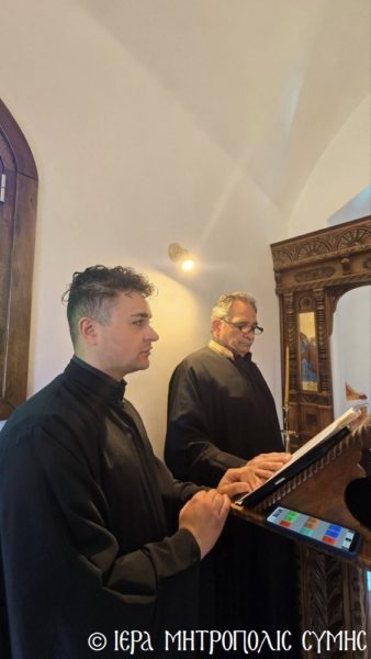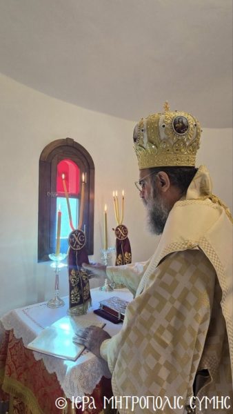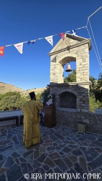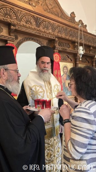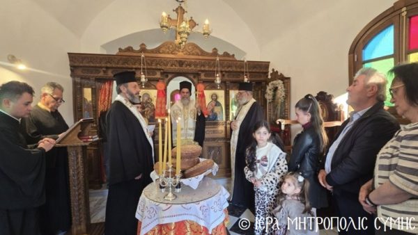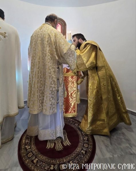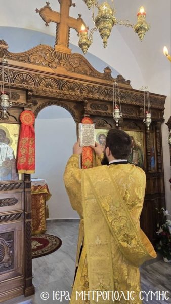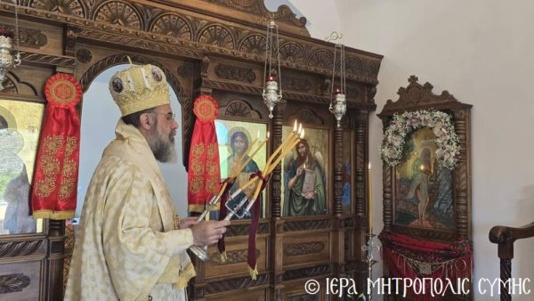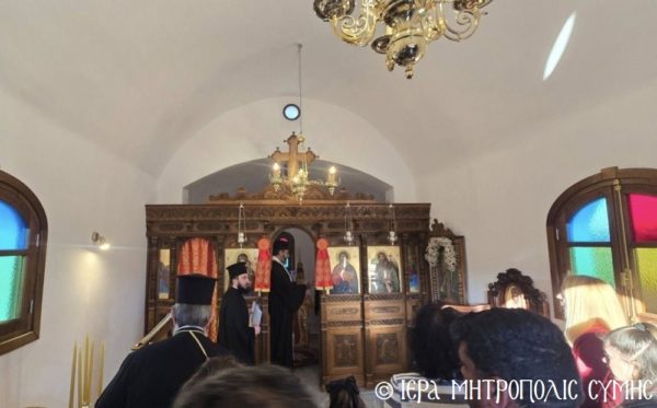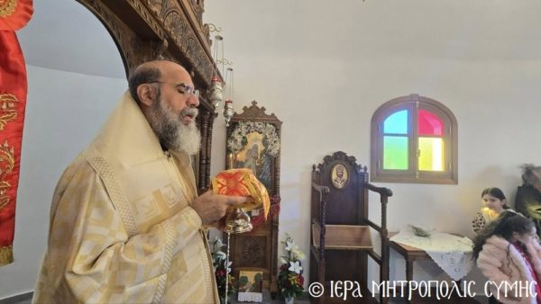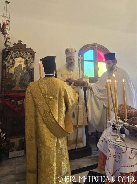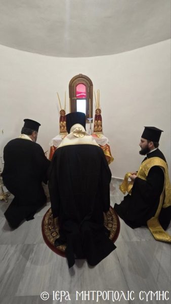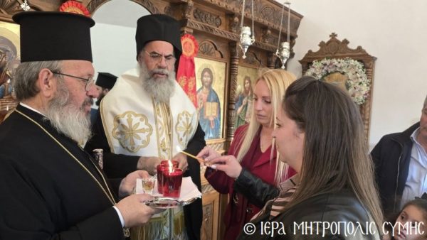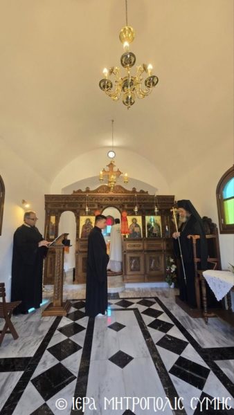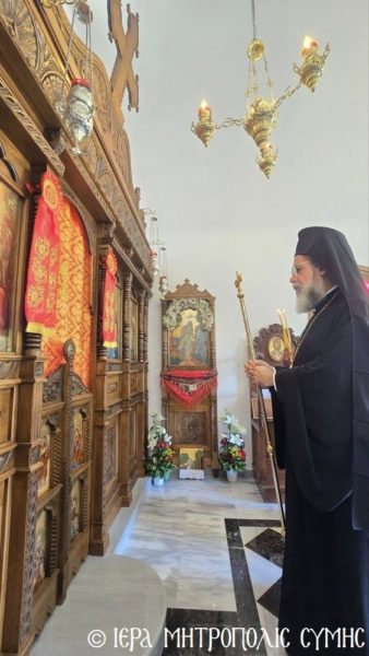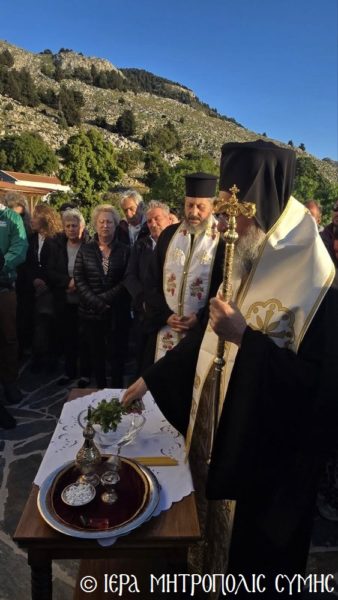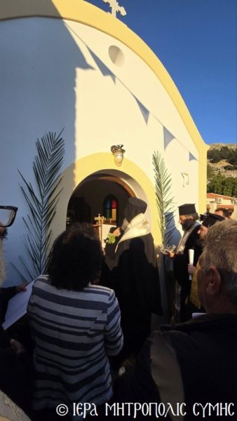 Σήμερα το πρωί, Δευτέρα 20η Απριλίου, ο Σεβασμιώτατος Μητροπολίτης Σύμης, Τήλου, Χάλκης και Καστελλορίζου κ. Χρυσόστομος χοροστάτησε στον Όρθρο και ετέλεσε την πρώτη Θεία Λειτουργία στον νεόδμητο Ιερό Ναό του Οσίου Ονουφρίου, με συλλειτουργούς του τον Αιδεσ. Πρεσβύτερο Αντώνιο Μανιά και τον Ιεροδιάκονο Παύλο Τερεζάκη, με την συμμετοχή πολυπληθούς εκκλησιάσματος. Μετά την απόλυση, οι κτίτορες παρέθεσαν εις τους εκκλησιασθέντες τα πατροπαράδοτα κεράσματα της Συμαϊκής φιλοξενίας.