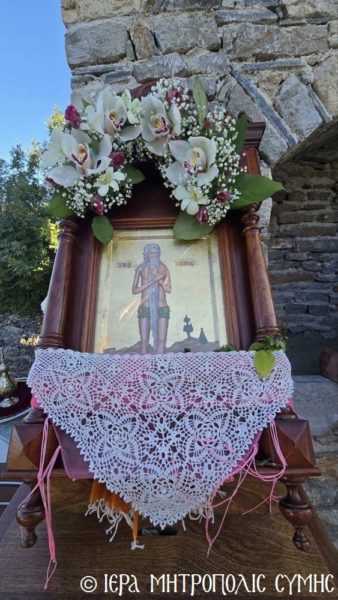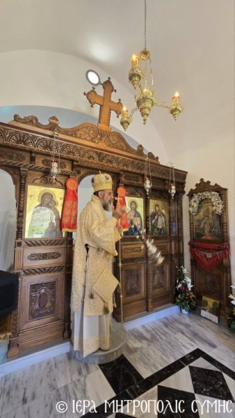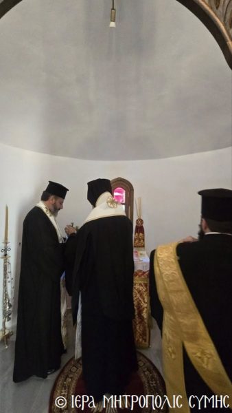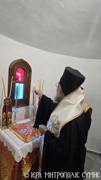 Μετά την τέλεση του Αγιασμού των Θυρανοιξίων και τον ραντισμό εξωτερικώς και εσωτερικώς του Ιερού Ναού, ο Σεβασμιώτατος ράντισε με τον Αγιασμό και έχρισε δι’ αγίου Μύρου την Αγία Τράπεζα, ανάπτοντας το πρώτον την ακοίμητη κανδήλα του Ιερού Θυσιαστηρίου, ενώ στην συνέχεια επέδωσε το κηρίον εις τα Μέλη της Οικογενείας των Κτιτόρων, προκειμένου να ανάψουν και τις υπόλοιπες κανδήλες. Τέλος, υπέρ υγείας αυτών ετελέσθη η Αρτοκλασία και ο Σεβασμιώτατος Μητροπολίτης κ. Χρυσόστομος ομιλών εμπνευσμένως, ανεφέρθη εις την μορφή του «εν σώματι Αγγέλου» Οσίου Ονουφρίου, και επαίνεσε την οικογένεια Πορτοκάλλη για την ιδιαίτερη μέριμνα και τον θείο ζήλο που επέδειξαν διά την ανέγερση και τον επιμελέστατο εξωραισμό του Εξωκκλησίου, επικαλούμενος την ευλογίαν του τιμωμένου Αγίου εις την ζωήν όλων. Ακολούθησε στον ειδυλλιακό αύλιο χώρο η προσφορά πλουσίων κερασμάτων στους συμμετέχοντας.