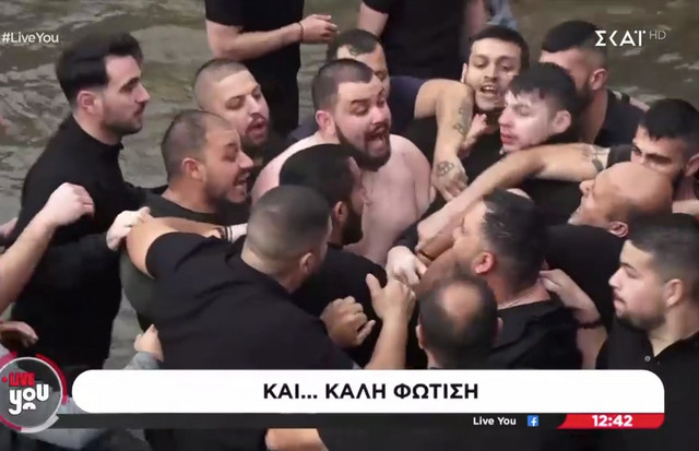 Η ομάδα των ανδρών που περίμενε τη ρίψη του Σταυρού κυριολεκτικά συνεπλάκη με μπουνιές, κλωτσιές και αρκετά «γαλλικά», συνθέτοντας μία εικόνα που καθόλου δεν ταιριάζει με το κλίμα κατάνυξης που προστάζει η μέρα.