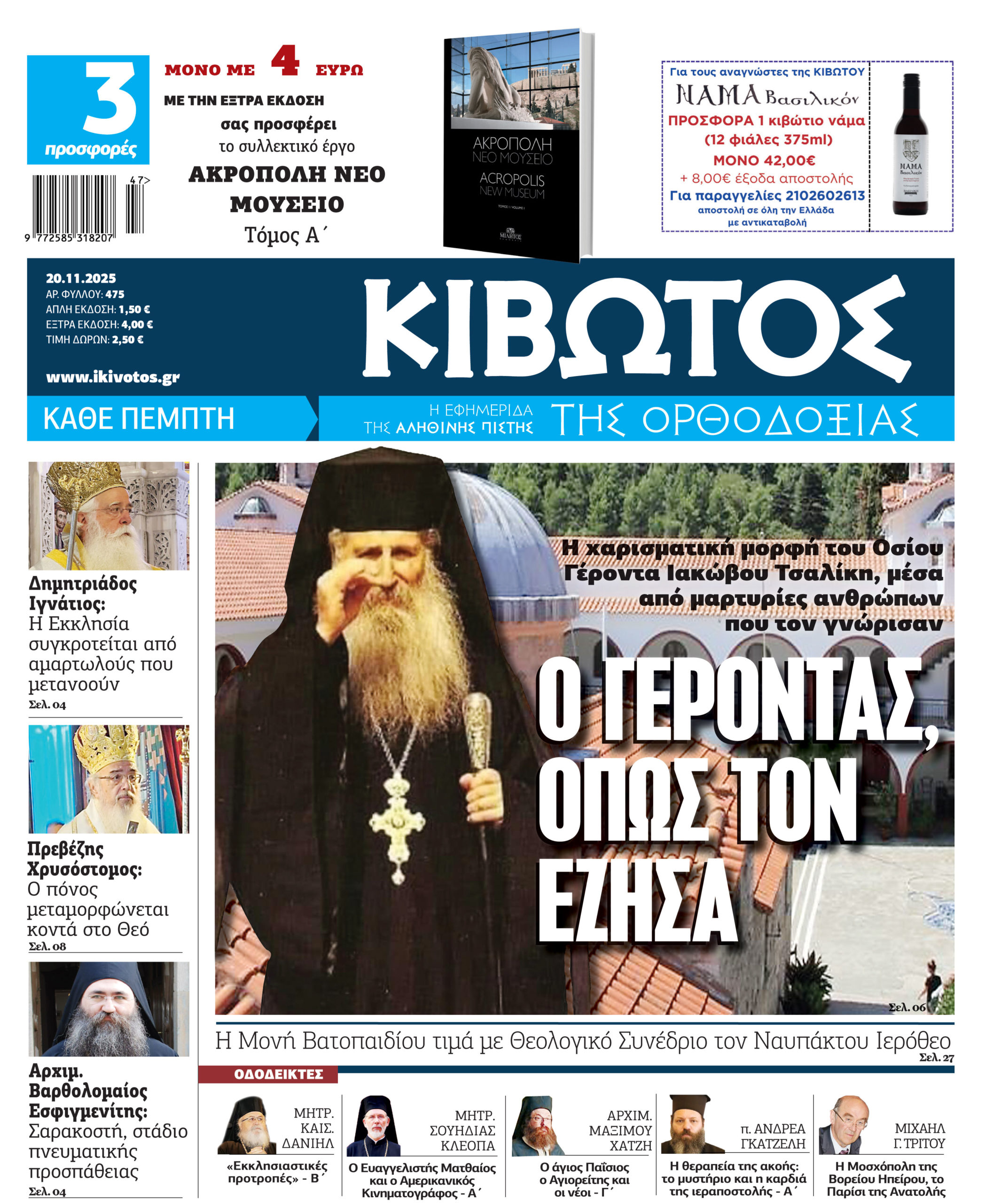 Την Πέμπτη, 20 Νοεμβρίου, κυκλοφορεί το νέο φύλλο της Εφημερίδας «Κιβωτός της Ορθοδοξίας»