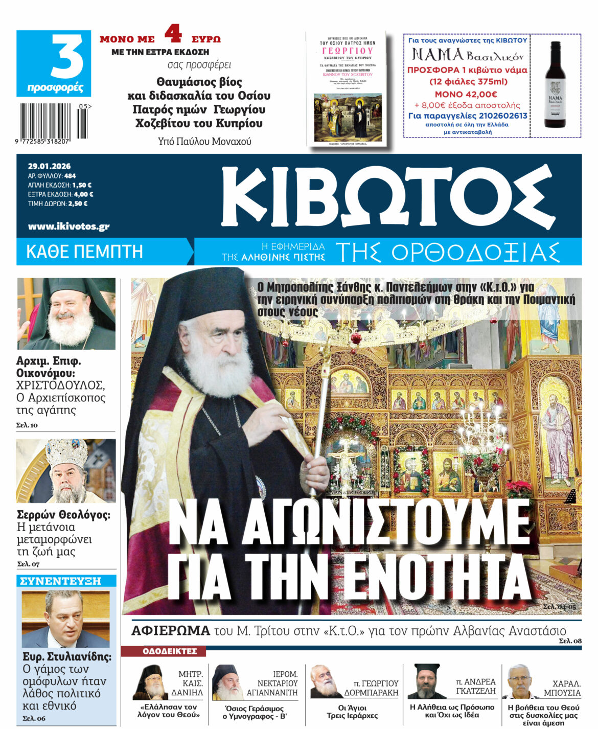 Την Πέμπτη, 29 Ιανουαρίου, κυκλοφορεί το νέο φύλλο της Εφημερίδας «Κιβωτός της Ορθοδοξίας»