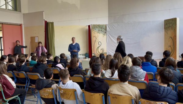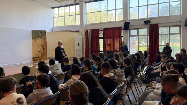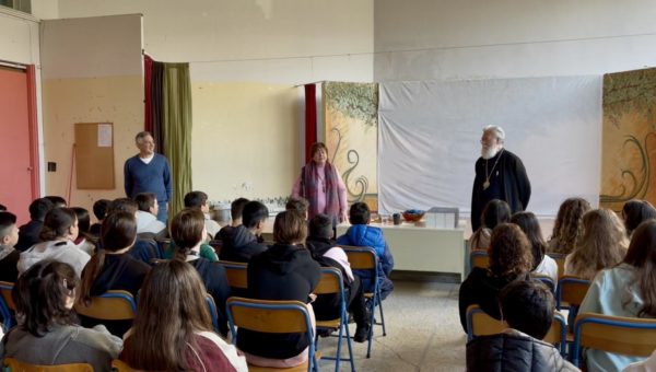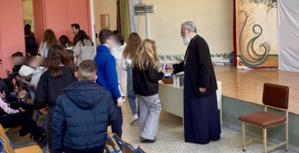 Στη συνέχεια, κατά τη δεύτερη διδακτική ώρα, ο Σεβασμιώτατος μετέβη στην αίθουσα εκδηλώσεων του σχολείου, όπου συγκεντρώθηκαν μαθητές των τεσσάρων τμημάτων της Α΄ Γυμνασίου και εκπαιδευτικοί.