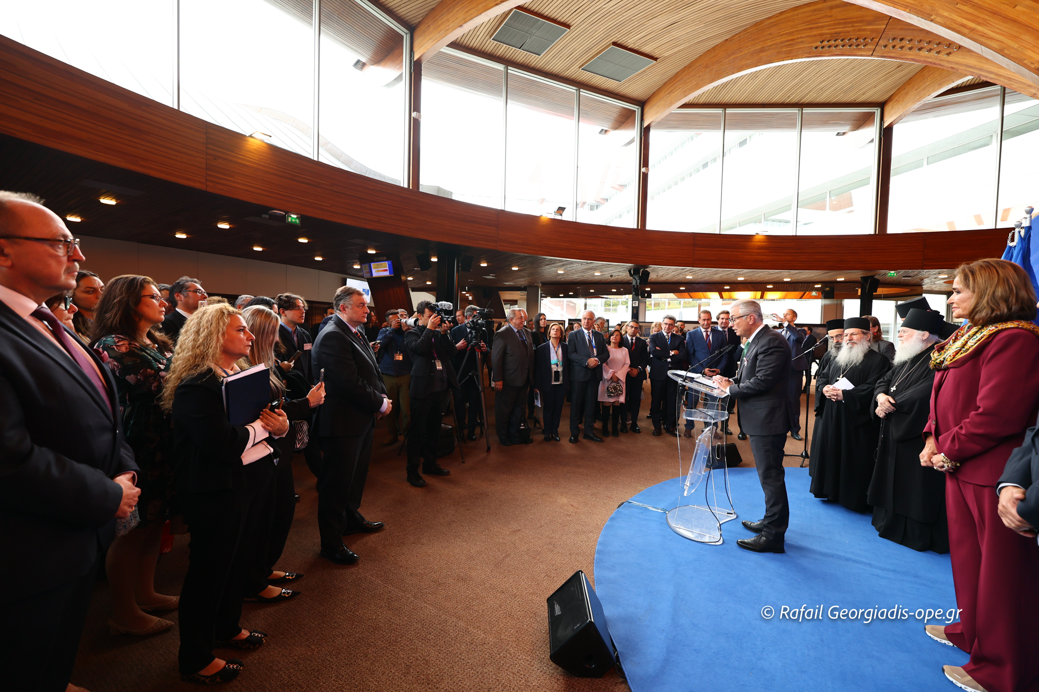 Ο πρόεδρος του Συμβουλίου της Ευρώπης κ. Θεόδωρος Ρουσόπουλος κατά την έναρξη της ολομέλειας μίλησε για την παρουσία της αντιπροσωπείας από το Άγιο Όρος ευχαριστώντας τους ηγουμένους των Ιερών Μονών Βατοπαιδίου και Σίμωνος Πέτρας, Γέροντα Εφραίμ και Γέροντα Ελισαίο που έδωσαν ευλογία να εκτεθούν τα κειμήλια στο Στρασβούργο και οι φωτογραφικές στιγμές της αγιορείτικης ζωής από τα Μοναστήρια τους.