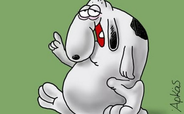Στο σκίτσο του πρωταγωνιστής είναι ο σκύλος που κάθεται σκεπτικός.