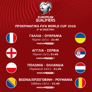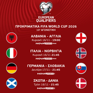 Στα κανάλια Novasports δεσπόζει η δράση στα UEFA European Qualifiers για το Μουντιάλ του 2026 και οι συνδρομητές θα έχουν την ευκαιρία να απολαύσουν όλους τους αγώνες για τις δύο τελευταίες αγωνιστικές στη φάση των ομίλων όπου δεσπόζουν οι αναμετρήσεις Γαλλία – Ουκρανία (13/11, 21:45), Αγγλία – Σερβία (13/11, 21:45), Ιρλανδία – Πορτογαλία (13/11, 21:45), Πολωνία – Ολλανδία (14/11, 21:45), Τουρκία – Βουλγαρία (15/11, 19:00), Γεωργία – Ισπανία (15/11, 19:00), Αλβανία – Αγγλία (16/11, 19:00), Ιταλία – Νορβηγία (16/11, 21:45), Γερμανία – Σλοβακία (17/11, 21:45), Σκωτία – Δανία (18/11, 21:45) οι οποίες θα μεταδοθούν LIVE.