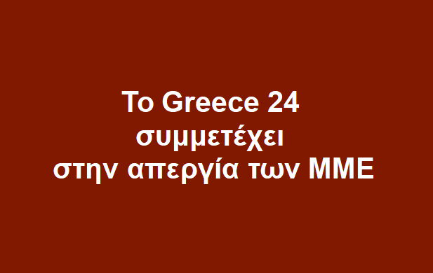Το GREECE 24 συμμετέχει στην 24η Απεργία των ΜΜΕ Share Το GREECE 24 συμμετέχει στην 24η Απεργία των ΜΜΕ Share FacebookTwitterGoogle+ReddItWhatsAppPinterestΗΛΕΚΤΡΟΝΙΚΗ ΔΙΕΥΘΥΝΣΗ