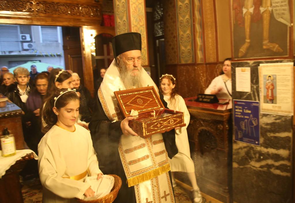 Το πρωί της Κυριακής, 11 Ιανουαρίου, ο Σεβασμιώτατος κ. Ιερόθεος χοροστάτησε στον αναστάσιμο Όρθρο και τέλεσε την θεία Λειτουργία πλαισιούμενος από τους Ιερείς του Ιερού Ναού και τους Διακόνους του. Στο κήρυγμά του ο Σεβασμιώτατος, ανέφερε την προφητεία του προφήτου Ησαίου που περιλαμβάνεται στο ευαγγελικό ανάγνωσμα της Κυριακής, «ο λαός ο πορευόμενος εν σκότει είδε φως μέγα», αφού ο Χριστός μετά την Βάπτισή Του στον Ιορδάνη ποταμό και την αντιμετώπιση των πειρασμών στην έρημο, άρχισε να κηρύττη την μετάνοια. Στην συνέχεια ερμήνευσε το χωρίο αυτό με βάση ένα κήρυγμα του αγίου Καλλινίκου αυτήν την Κυριακή.