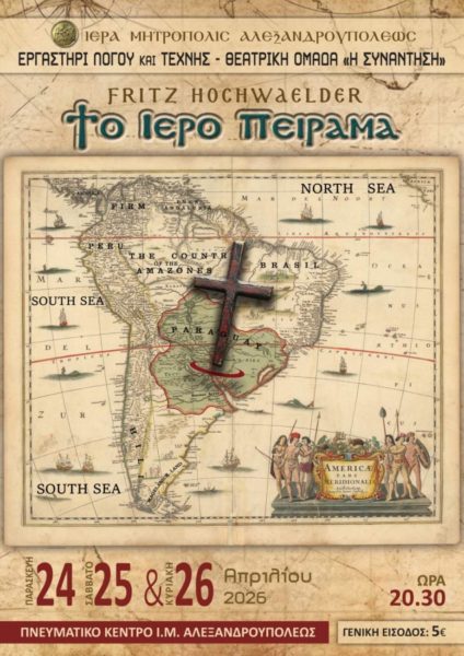 Οι παραστάσεις θα πραγματοποιηθούν στο Θέατρο του Πνευματικού Κέντρου της Ιεράς Μητροπόλεως Αλεξανδρουπόλεως, την Παρασκευή 24, το Σάββατο 25 και την Κυριακή 26 Απριλίου, με ώρα έναρξης 20:30.