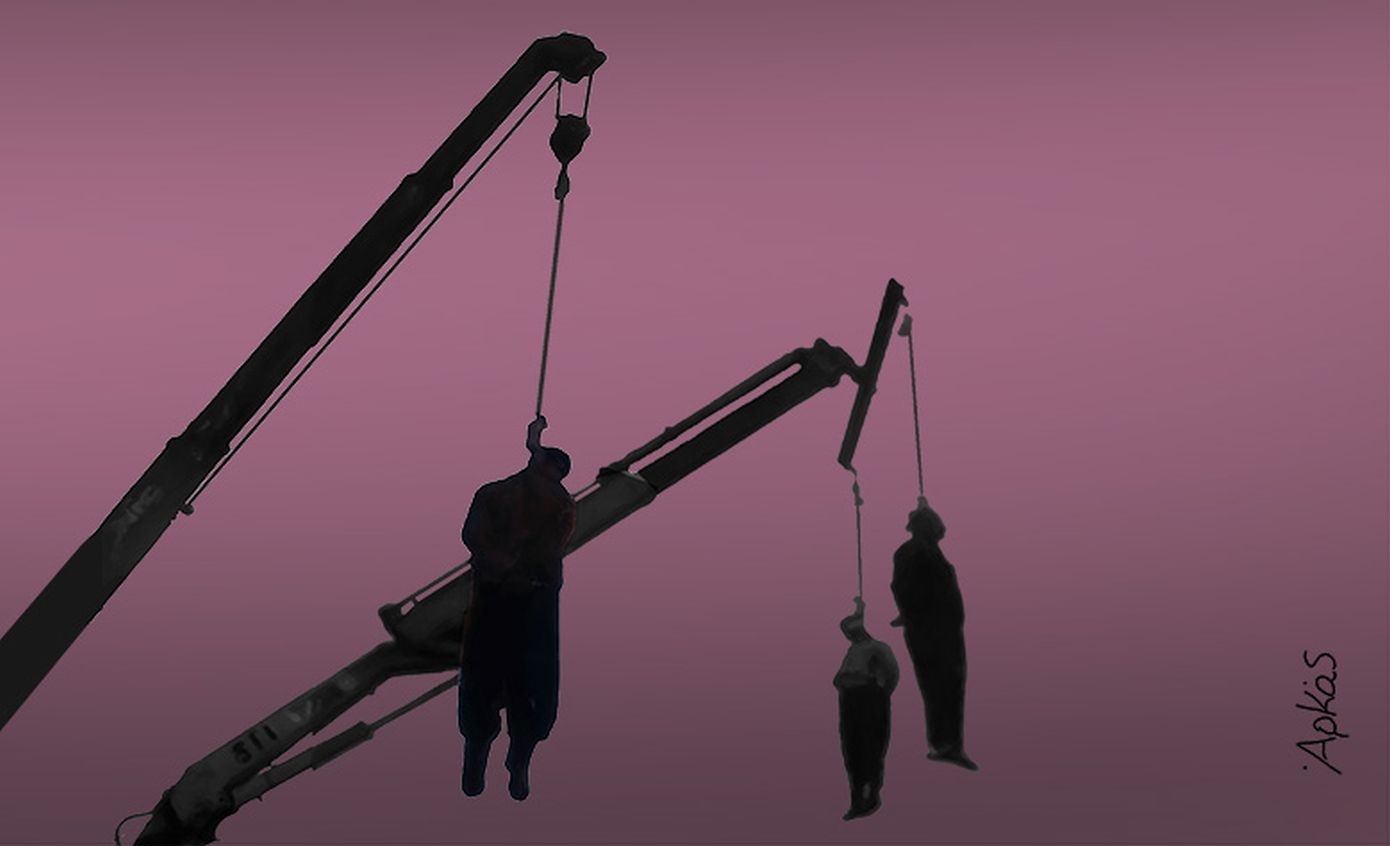 Στο σκίτσο διακρίνεται ο σκοτεινιασμένος ουρανός και άνθρωποι κρεμασμένοι από γερανούς.