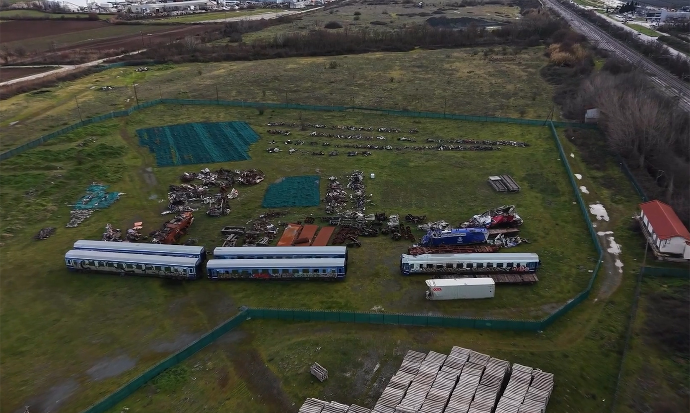 Τα πλάνα από το drone του Orange Press Agency αποτυπώνουν μια εικόνα που προκαλεί δέος: δεκάδες τόνοι από παραμορφωμένα μέταλλα, διαλυμένα βαγόνια και μηχανές έλξης της επιβατικής και της εμπορικής αμαξοστοιχίας, παρατεταγμένα σε ένα περιφραγμένο οικόπεδο δίπλα στο αμαξοστάσιο του ΟΣΕ.