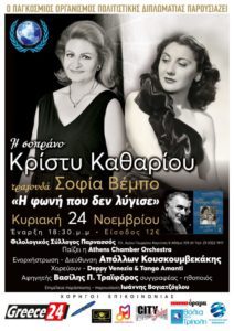 Παγκόσμιος Οργανισμός Πολιτιστικής Διπλωματίας (I.A.C.D.) προβάλλοντας την Ελλάδα ως μια χώρα με πλούσια ιστορία και πολιτιστική κληρονομιά, ενισχύοντας παράλληλα τις Διεθνείς Σχέσεις και την εικόνα της στον παγκόσμιο χάρτη, διοργανώνει στις 24 Νοεμβρίου 2024, ημέρα Κυριακή και ώρα 18:30μ.μ στον Φιλολογικό Σύλλογο “Παρνασσός”  ένα ξεχωριστό αφιέρωμα στη ζωή και το πατριωτικό έργο της ΣΟΦΙΑΣ ΒΕΜΠΟ.