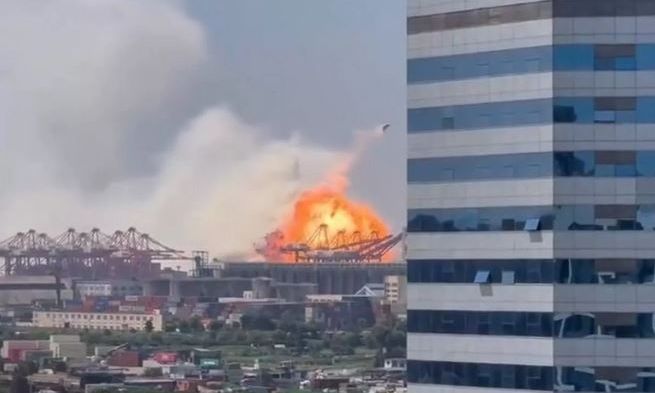 Οι εικόνες φαίνεται να δείχνουν ότι η έκρηξη προήλθε από ένα εμπορευματοκιβώτιο που βρίσκεται στο μπροστινό μέρος του πλοίου, με πυκνό μαύρο καπνό να υψώνεται από το πλοίο. Συντρίμμια εκτοξεύονται στον αέρα καθώς πυκνός καπνός υψώνεται ψηλά πάνω από το λιμάνι.
