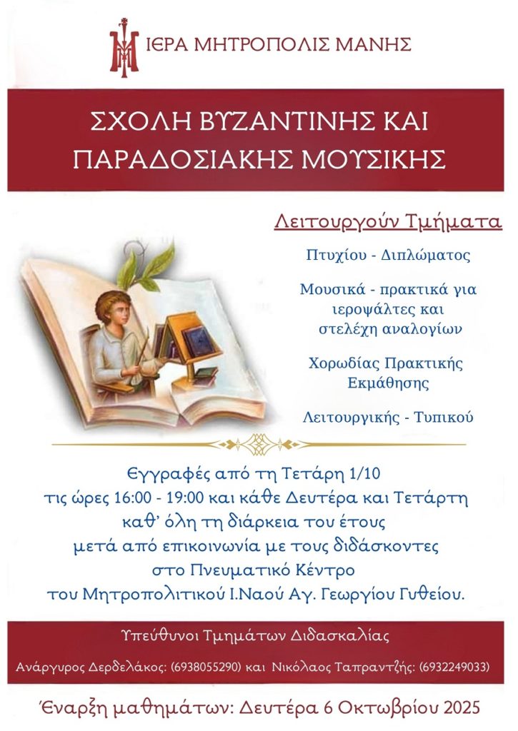 Από την Ιερά Μητρόπολη Μάνης ανακοινώνεται ότι με τη σεπτή ευλογία του Σεβ. Μητροπολίτη Μάνης κ. Χρυσοστόμου Γ’ για ακόμα μία χρονιά θα λειτουργήσει η Σχολή Βυζαντινής και Παραδοσιακής Μουσικής (Τμήματα Πτυχίου – Διπλώματος, μουσικά πρακτικά για υφιστάμενους ιεροψάλτες και στελέχη αναλογίων, χορωδία πρακτικής εκμάθησης ύμνων, λειτουργικής – τυπικού).