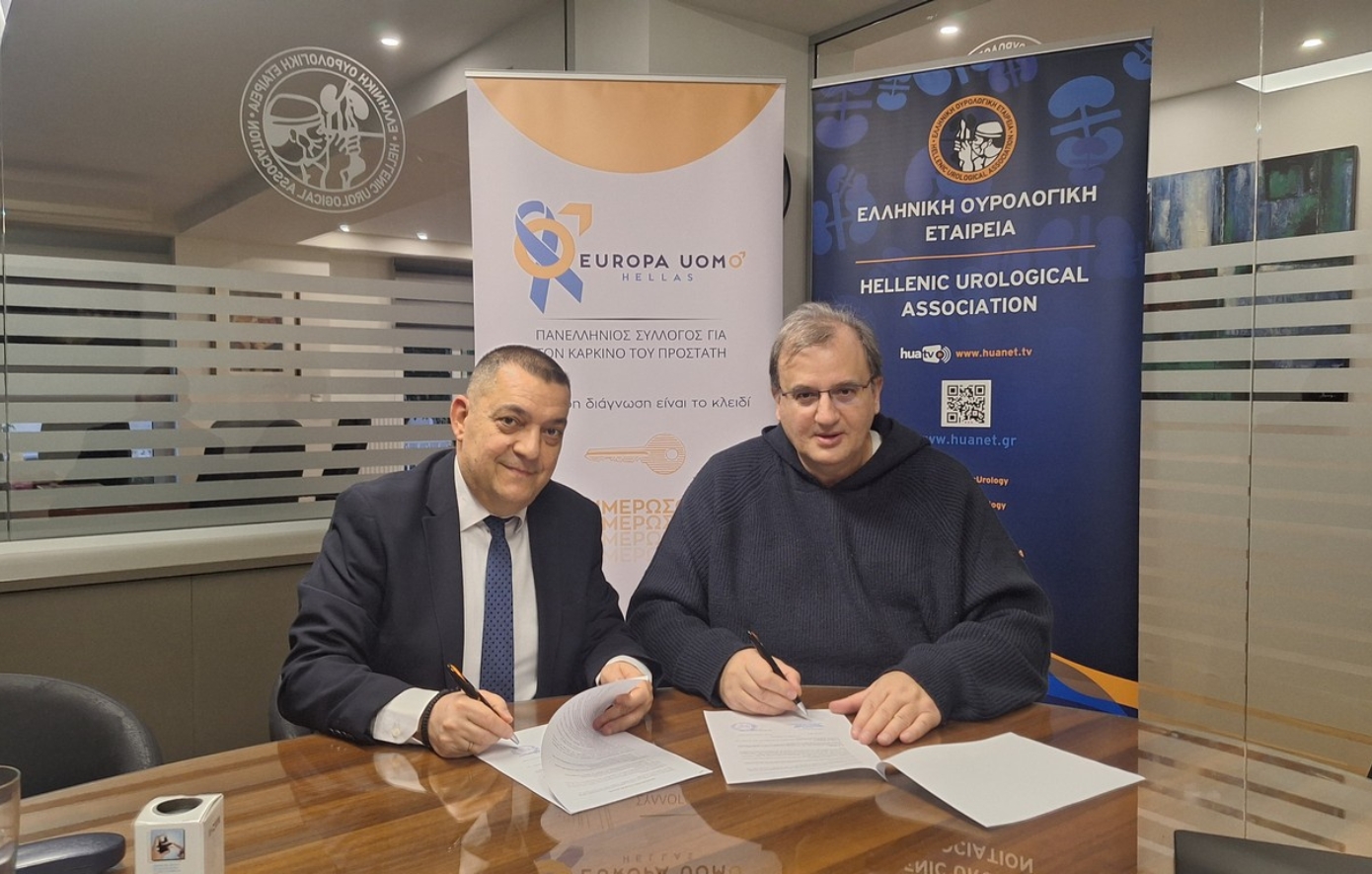 Ο Πρόεδρος της Ελληνικής Ουρολογικής Εταιρείας κ. Ανδρέας Σκολαρίκος και ο Πρόεδρος της Europa Uomo Hellas κ. Δημήτρης Δεληγιαννίδης προχώρησαν στην υπογραφή Συμφώνου Συνεργασίας και Κοινών Δράσεων, σηματοδοτώντας την έναρξη μιας οργανωμένης και ουσιαστικής συνεργασίας μεταξύ της επιστημονικής ιατρικής κοινότητας και της οργανωμένης εκπροσώπησης των ασθενών με καρκίνο του προστάτη στην Ελλάδα.