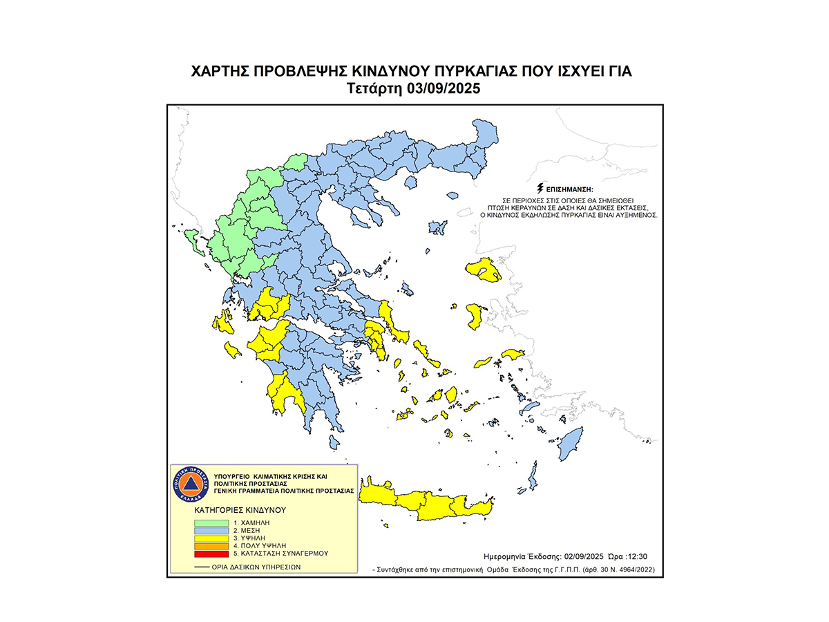Σύμφωνα με το Χάρτη Πρόβλεψης Κινδύνου Πυρκαγιάς, τον οποίο εκδίδει η Γενική Γραμματεία Πολιτικής Προστασίας του Υπουργείου Κλιματικής Κρίσης & Πολιτικής Προστασίας για την Τετάρτη 3 Σεπτεμβρίου προβλέπεται υψηλός κίνδυνος δασικής πυρκαγιάς (κατηγορία κινδύνου 3) στην ΠΕ Μεσσηνίας.