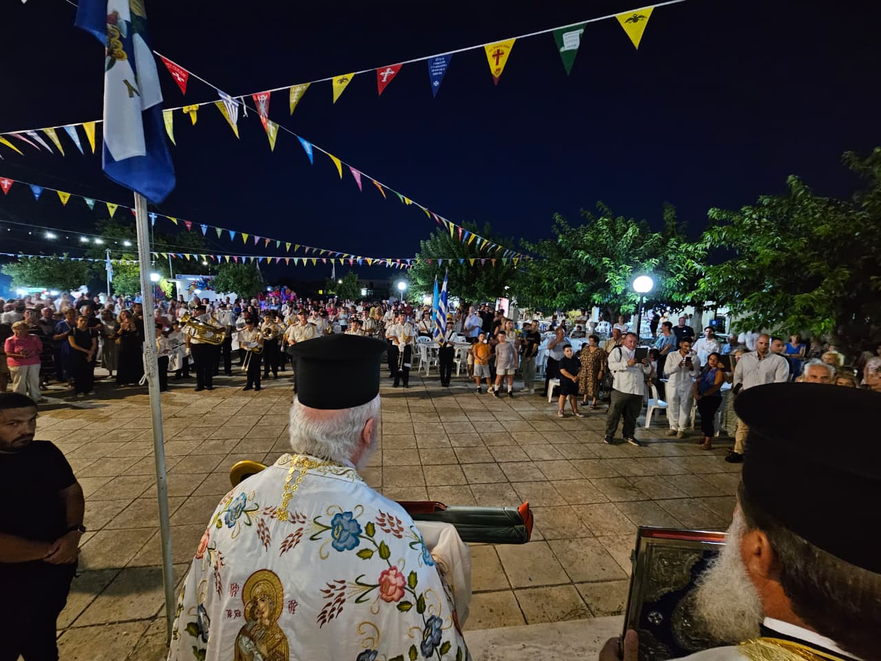 Μετά την δέηση στα σκαλούνια του Ναού της Παναγούλας, ο οικείος Εφημέριος, Πρωτοπρεσβύτερος του Οικουμενικού Θρόνου Παναγιώτης Καποδίστριας, ομίλησε προς τους πανηγυριστές περί της οφειλομένης τιμής και προσκύνησης της Παναγίας Μητέρας του Θεού και των ανθρώπων, εξαιτίας της συμβολής Της στην διάσωση και θέωση του ανθρώπινου γένους. Κατακλείοντας, ευχαρίστησε θερμά όσους συμμετείχαν στην προετοιμασία και πραγματοποίηση της Πανηγύρεως, κυρίως τα Μέλη του Εκκλησιαστικού Συμβουλίου, τα Μέλη της Επιτροπής Πανηγύρεως και τους Χορηγούς, που υπερέβαλαν εαυτούς για την επιτυχία της όλης πολυαπαιτητικής διοργάνωσης.