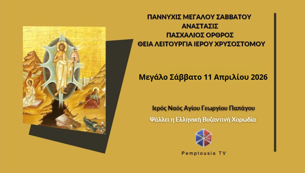 Παρακολουθήστε ζωντανά από την Pemptousia TV την Παννυχίδα του Μεγάλου Σαββάτου, την Ανάσταση, τον Πασχάλιο Όρθρο, και τη Θεία Λειτουργία του Ιερού Χρυσοστόμου που τελούνται στον Ιερό Ναό Αγίου Γεωργίου Παπάγου το Μεγάλο Σάββατο 11 Απριλίου 2026: